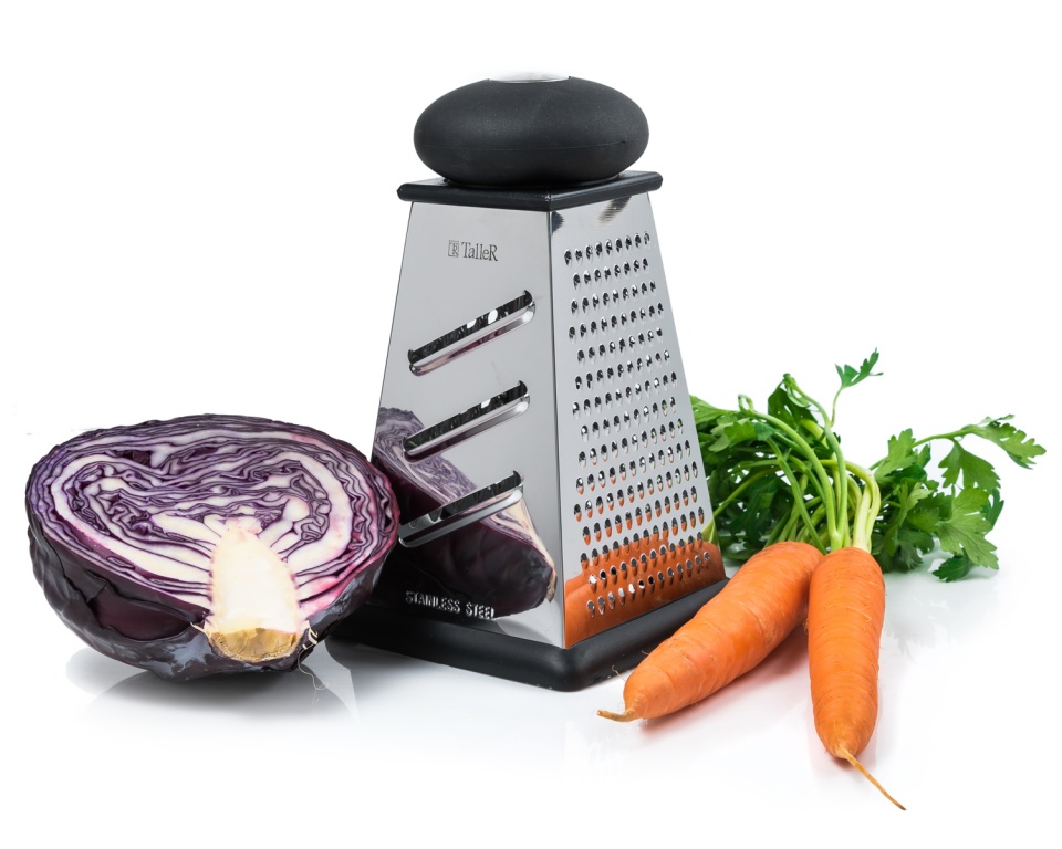 Размеры: высота - 21,5 см, основание - 12,5*12,5 см, толщина - 0,3 мм. Материал: высококачественная нержавеющая сталь марки AISI 430. 4 вида лезвий: крупная терка, средняя терка, мелкая терка, шинковка. Силиконовая объемная ручка удобной формы не выскальзывает из рук даже при намокании. Нескользящий силиконовый протектор на основании предотвращает скольжение во время использования и защищает поверхность от повреждений.