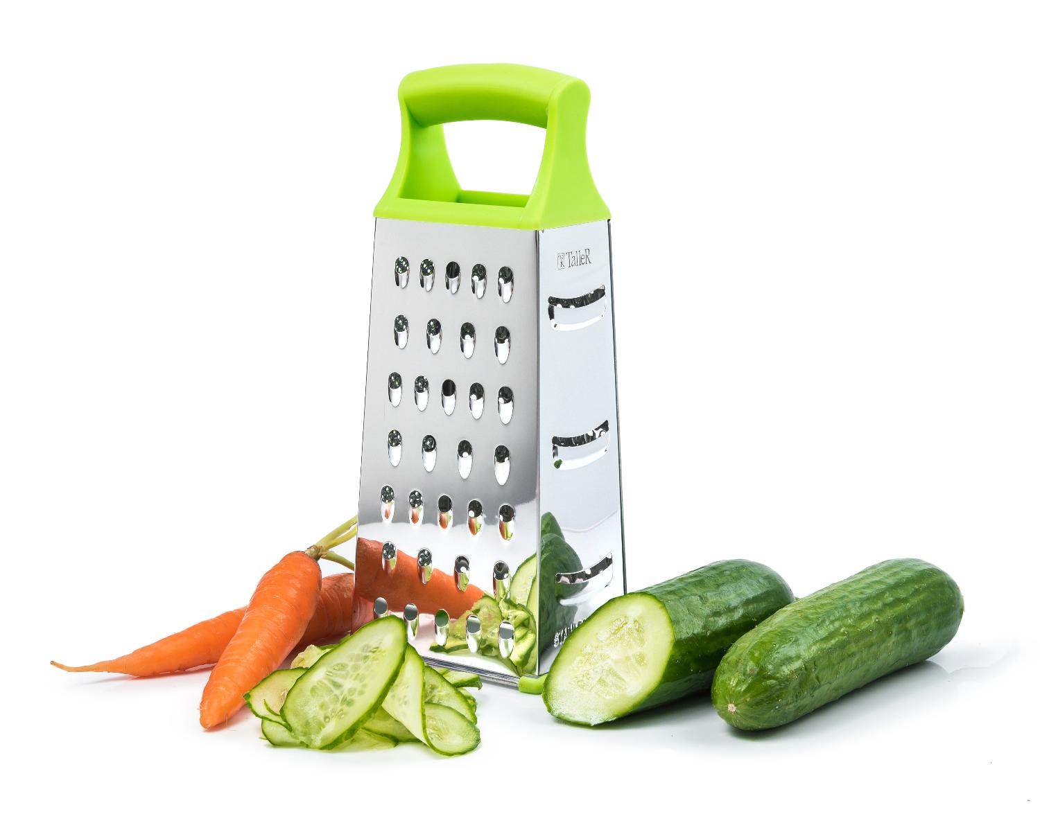 Размеры: высота - 22,3 см, основание - 9 х 7 см, толщина - 0,25 мм. Материал: высококачественная нержавеющая сталь марки AISI 430. 4 вида лезвий: крупная терка, средняя терка, мелкая терка, шинковка. Ручка удобной формы не выскальзывает из рук даже при намокании. Нескользящие силиконовые протекторы на основании предотвращают скольжение во время использования и защищает поверхность от повреждений.