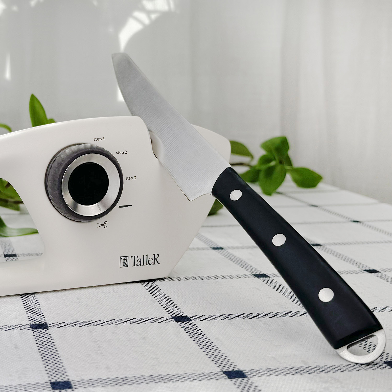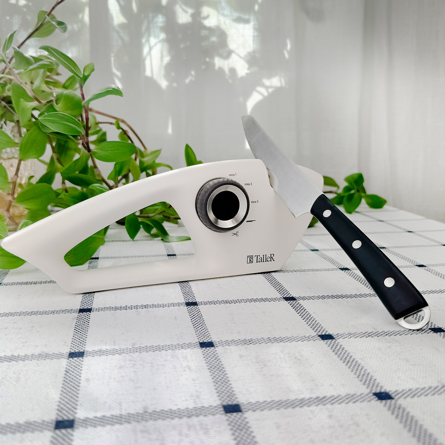 Размеры: 25,7 x 9,6 x 5,3 см. Цвет корпуса - молочный. Цвет поворотной ручки - коричневый. Подходит для всех стальных кухонных ножей и для заточки ножниц. Сменяемые элементы подойдут для заточки различных типов ножей, включая ножи для нарезки хлеба. Корпус выполнен из пищевого пластика. Удобная прорезиненная поворотная ручка переключения. Силиконовые противоскользящие протекторы. Комфортная ручка. 3-х ступенчатая заточка стальных ножей.