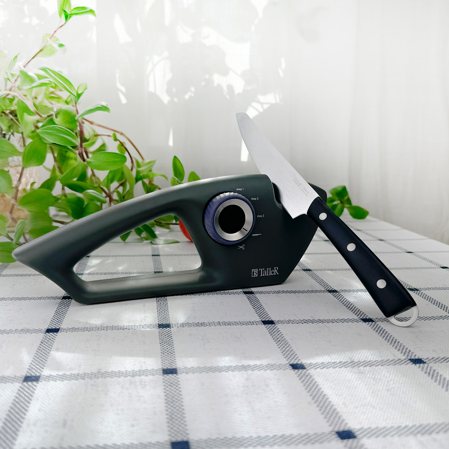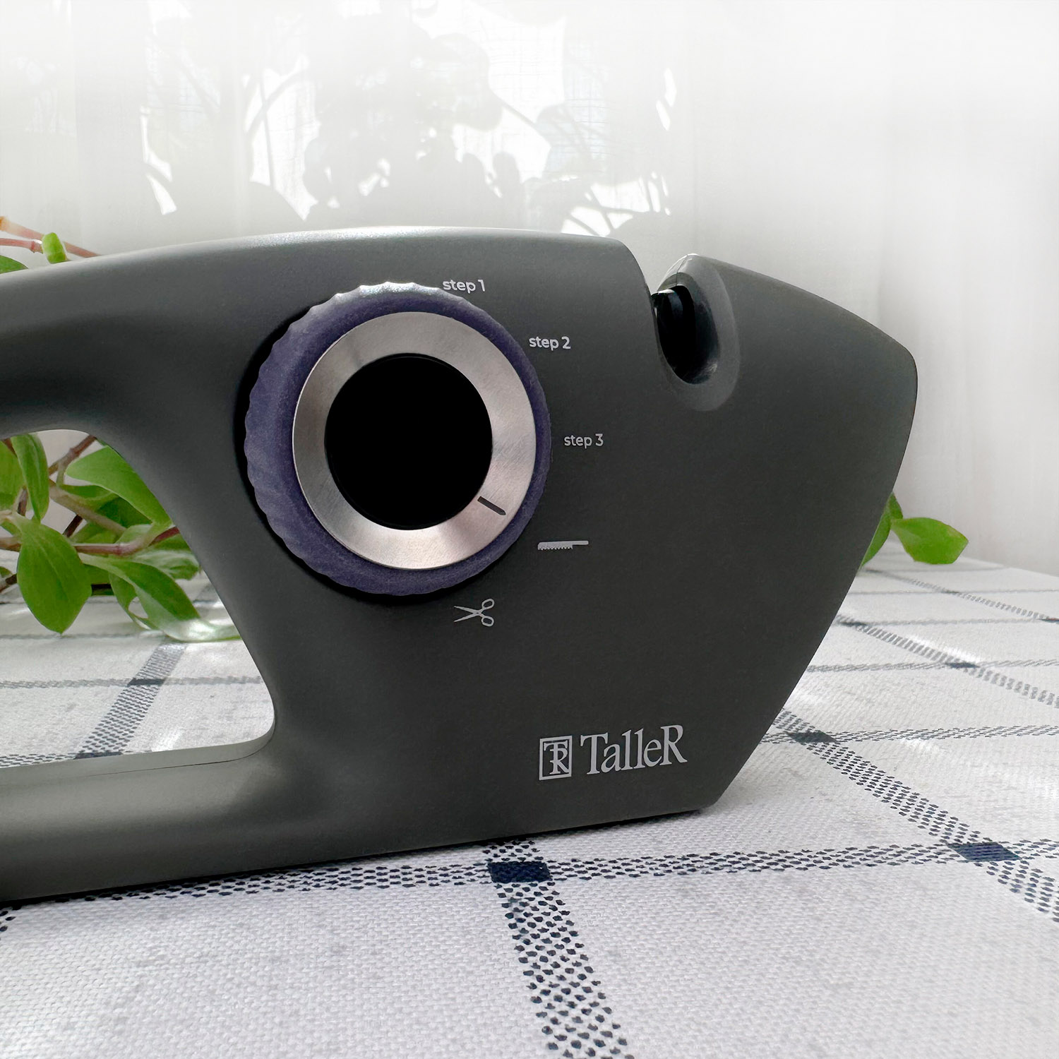 Размеры: 25,7 x 9,6 x 5,3 см. Цвет корпуса - темно-серый. Цвет поворотной ручки - фиолетовый. Подходит для всех стальных кухонных ножей и для заточки ножниц. Сменяемые элементы подойдут для заточки различных типов ножей, включая ножи для нарезки хлеба. Корпус выполнен из пищевого пластика. Удобная прорезиненная поворотная ручка переключения. Силиконовые противоскользящие протекторы. Комфортная ручка.