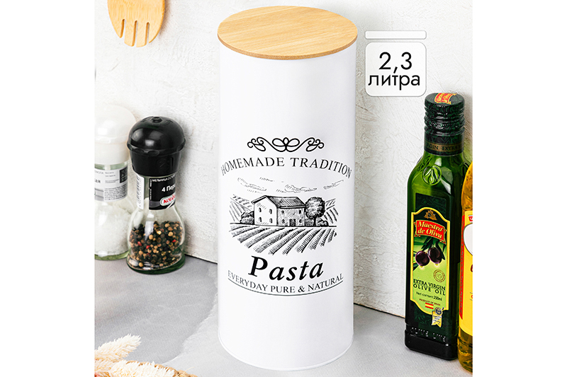 Банка для хранения послужит органайзером на вашей кухне. Размер ёмкости – 11х11х27 см, объём – 2,3 литра. Крышка выполнена из натурального бамбука, обеспечивает герметичность закрывания и целостность содержимого. На белую поверхность жестяного изделия нанесён минималистичный рисунок в виде деревенского домика на фоне полей, а также надписи на английском: «Homemade tradition. Pasta. Everyday pure & natural» («Домашняя традиция. Паста. Ежедневная чистота и натуральность»). Отлично подойдёт для разнообразных сыпучих продуктов: чая, кофе, сахара и соли, приправ и специй. Храните в ней крупы и макаронные изделия, в том числе вермишель, а также ягоды, орехи и сухофрукты. Заполните контейнер сладостями и другими угощениями: конфетами, леденцами или печеньем. Подайте баночку к столу, чтобы идеально дополнить чайную сервировку! Не рекомендуется применять абразивные моющие средства. Не подходит для использования в посудомоечной машине и микроволновой печи. Бамбук нельзя замачивать! Поставляется в красивой картонной коробке – благодаря ей вам не потребуется дополнительная подарочная упаковка. Это идеальный подарок для хозяйки, ценящей не только практичность, но и стиль. Баночка создаст уют тёплой домашней атмосферы и подчеркнёт вашу оригинальность!
