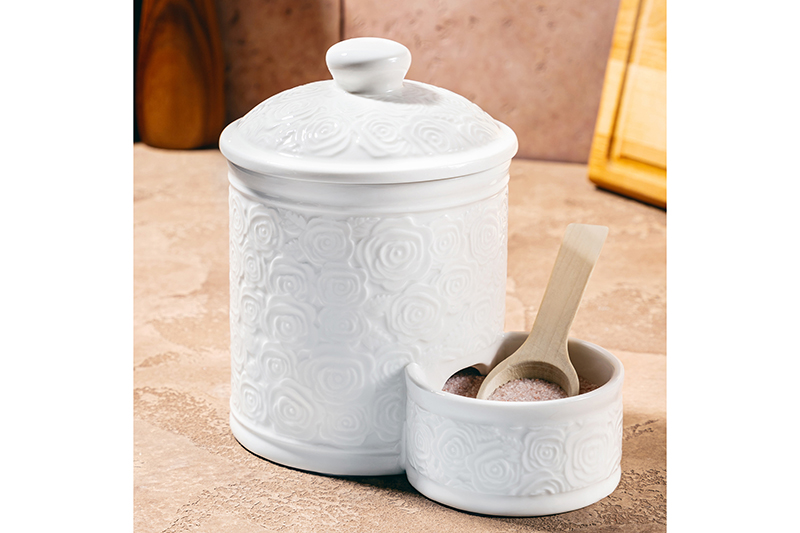 Банка из серии «Розы» от Elan Gallery послужит для организации хранения продуктов на вашей кухне. Размер ёмкости – 15,5х10х14,5 см, объём – 500 мл. Высота внешней солонки – 4 см, объём – 75 мл. Выполнена из высококачественного белого фарфора. Он не впитывает цвет продуктов и легко отмывается, благодаря чему надолго сохраняет свою белизну. Поверхность изделия украшают рельефные узоры в виде пышных бутонов роз. Ложка выполнена из натурального бамбука. Ёмкость подойдёт для хранения разнообразных сыпучих продуктов. Заполните её сахаром и солью, специями и приправами, чтобы во время приготовления и приёма пищи всё необходимое было под рукой. Засыпьте внутрь чай или кофе, чтобы в любой момент заварить свежий напиток. Подайте вместе с горячими блюдами, чтобы каждый мог приправить пищу по своему вкусу. Ложечка поможет удобно набрать необходимое количество продуктов. Банка имеет оригинальную форму, которая позволяет эффективнее расходовать содержимое и предотвращать скопление остатков на дне. Такое изделие отлично дополнит сервировку стола как для сытного завтрака, так и для уютного чаепития. Не рекомендуется применять абразивные моющие средства. Без ложки подходит для использования в посудомоечной машине и микроволновой печи. Бамбук нельзя замачивать! Поставляется в дизайнерской картонной коробке – благодаря ей вам не потребуется дополнительная подарочная упаковка. Фарфоровая сервировочная посуда будет оригинальным подарком для хозяйки, ценящей не только практичность, но и привлекательность. Серия «Розы» от бренда Элан Галерея станет украшением любого кухонного инвентаря и позволит собрать красивый сервиз в едином стиле! /