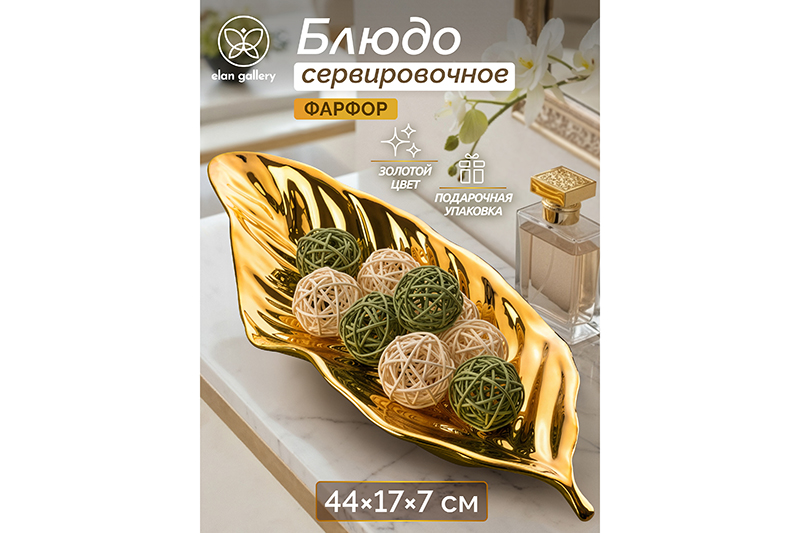 Фигурное сервировочное блюдо «Лист» предназначено для подачи разнообразных угощений и оформления декоративных композиций. Размер изделия – 44,8х17,5х7,7 см. Выполнено из качественного фарфора в форме большого детализированного листика золотого цвета. Фарфор не впитывает цвет продуктов и надолго сохранит свой изначальный вид. Декоративная фарфоровая тарелка украсит любой интерьер благодаря своему необычному дизайну и удивит даже самых привередливых гостей. Подойдёт для подачи сыра и колбасы, а также рыбных и мясных деликатесов. Красиво подайте к столу бутерброды с хлебом и сырной нарезкой. Идеально для сервировки закусок – суши, роллов и канапе, а также салатов, свежих фруктов и овощей. Наполните его десертами и сладостями: конфетами, печеньем, кусочками торта и пирога. Оригинальное блюдо послужит для украшения вашего дома в качестве декора. Поставьте его на тумбочку или полку в качестве самостоятельного декоративного элемента, сделайте частью композиции с искусственными фруктами, сухоцветами и другими предметами, чтобы украсить свой дом и привнести интерьеру изысканности. Не рекомендуется применять абразивные моющие средства. Не подходит для использования в микроволновой печи. Можно использовать в посудомоечной машине. Посуда поставляется в красивой картонной коробке – благодаря ей вам не потребуется дополнительная подарочная упаковка. Это приятный подарок на праздник для хозяйки, ценящей не только практичность, но и стиль. В коллекции бренда Elan Gallery представлено много товаров для создания комфорта и уюта на вашей кухне. Тарелка добавит роскоши вашему дому и создаст праздничную атмосферу даже в будний день!