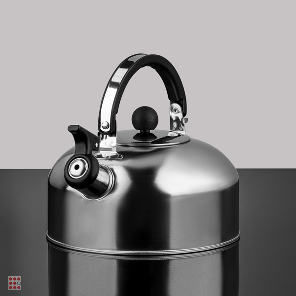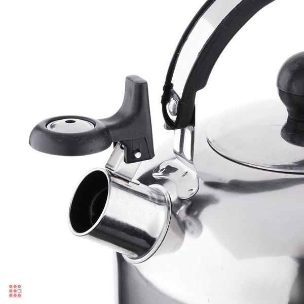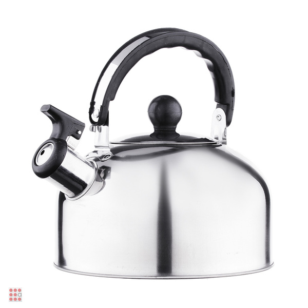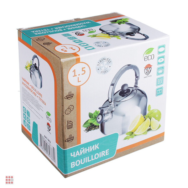 Чайник объемом 1,5 л изготовлен из нержавеющей стали, оснащен несъемным свистком и бакелитовой ручкой, с капсульным дном, подходит для использования на всех типах плит, включая индукцию.