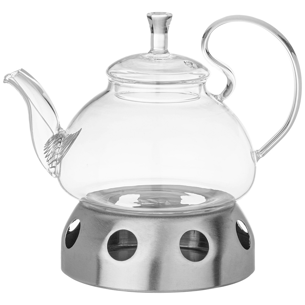 Заварочный стеклянный чайник выполнен в элегантной форме с изысканной ручкой.