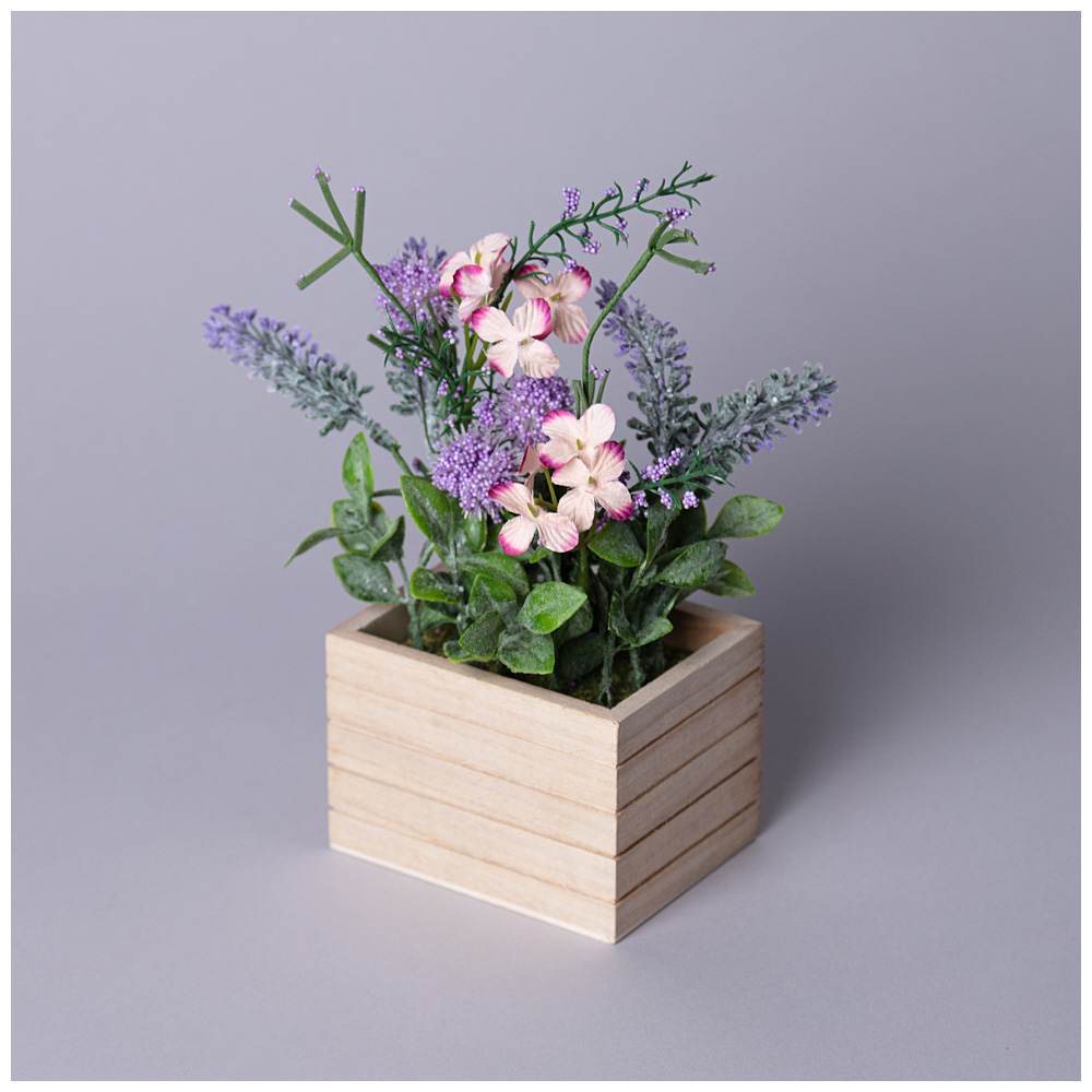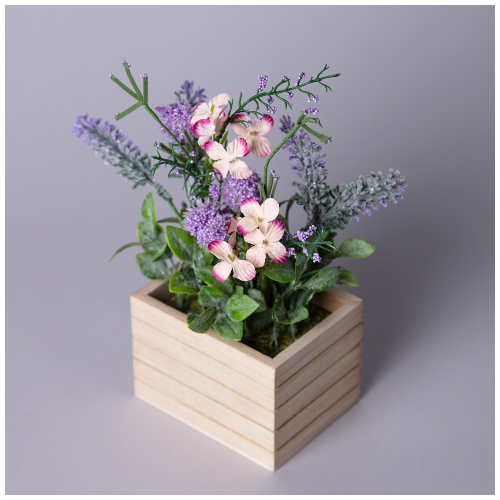 ЦВЕТОЧНАЯ КОМПОЗИЦИЯ В ДЕРЕВЯННОМ КАШПО ВЫСОТА=23СМ