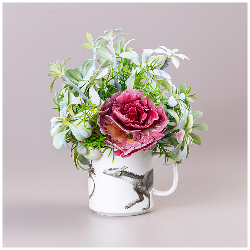 ЦВЕТОЧНАЯ КОМПОЗИЦИЯ В КРУЖКЕ "ВОЛШЕБНЫЙ ДРАКОН " ШИРИНА 21 см*ВЫСОТА 23 см- БЕЗ УПАКОВКИ