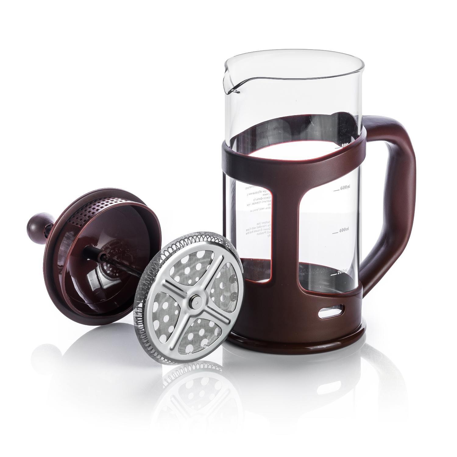 Колба выполнена из боросиликатного стекла, устойчивого к перепадам температур. Корпус выполнен из безопасного пищевого пластика (РР). Пресс выполнен из высококачественной нержавеющей стали. Разборная конструкция пресс-фильтра облегчает уход за изделием. Толщина колбы - 2 мм, толщина пресс-фильтра - 0,3 мм. Большой френч-пресс на целый литр подойдет для заваривания кофе, чая, травяных напитков.
