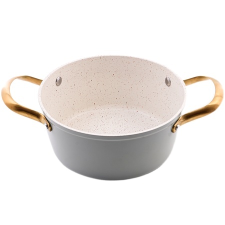 Представьте себе кухню, где царит порядок, и готовка превращается в настоящее удовольствие. Центральное место на ней занимает эта элегантная алюминиевая кастрюля, воплощение качества и практичности. Её основа – высококачественный кованый алюминий, материал, известный своей исключительной прочностью и способностью равномерно распределять тепло по всей поверхности. Это означает, что ваши блюда будут готовиться идеально, без "горячих пятен" и подгорания, при этом сохраняя все свои полезные свойства. Забудьте о постоянном помешивании и тревоге за пригорание пищи. Отличительной чертой этой кастрюли являются изящные золотистые ручки, изготовленные из высококачественной нержавеющей стали. Они не только придают изделию роскошный, элегантный вид, гармонично вписывающийся в любой кухонный интерьер, будь то классический или современный стиль, но и обеспечивают максимальный комфорт при использовании. Даже когда кастрюля раскалена до предела, ручки остаются приятно прохладными на ощупь, что исключает риск ожогов. Это особенно важно, когда вы готовите сложные блюда, требующие постоянного вмешательства. Внутреннее покрытие кастрюли – это трёхслойное мраморное антипригарное покрытие, настоящая находка для любителей здорового питания. Благодаря нему, пища не прилипает к стенкам, что позволяет готовить с минимальным количеством масла или вовсе без него. Это снижает калорийность блюд и сохраняет их естественный вкус и аромат. Представьте себе нежные омлеты, сочные тушеные овощи, или ароматный соус, которые легко отделяются от стенок, не оставляя после себя ни единого следа. Мытье такой кастрюли становится простым и быстрым делом. Внешнее покрытие кастрюли также заслуживает отдельного упоминания. Это специальное жаропрочное покрытие, предназначенное для защиты от высоких температур и механических повреждений. Оно сохранит безупречный внешний вид вашей кастрюли на протяжении многих лет, не позволяя ей деформироваться или утратить свой блеск. Даже после длительного использования, кастрюля будет выглядеть так же прекрасно, как в день покупки. И наконец, нельзя не отметить удобство использования этой кастрюли. Она полностью пригодна для мытья в посудомоечной машине, что значительно экономит ваше время и силы. Вам не придётся тратить драгоценные минуты на трудоёмкое оттирание пищи. Просто поместите кастрюлю в посудомоечную машину, и она будет готова к следующему использованию в кратчайшие сроки. В итоге, эта кастрюля – это не просто кухонный инвентарь, а настоящий помощник, который сделает ваш кулинарный опыт более приятным и эффективным. Её превосходное качество, стильный дизайн и практичность делают её идеальным выбором для тех, кто ценит комфорт, качество и долговечность. Она станет незаменимым элементом вашей кухни на долгие годы, радуя вас своим безупречным видом и функциональностью. От супов и соусов до тушеных блюд и мяса - эта кастрюля справится с любой задачей, делая процесс готовки легким и приятным.