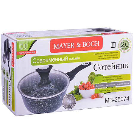 Ковш с крышкой от MAYER&BOCH – идеальное решение для приготовления вкусных и здоровых блюд. Ковш кухонный MAYER&BOCH диаметром 18 см - красивая и прочная штампованная алюминиевая посуда с антипригарным покрытием, что исключает возможность деформации и гарантирует долгий срок службы. Он не только является незаменимым в плане варки и тушения. Мраморное антипригарное покрытие позволяет готовить практически не используя масло, что значительно увеличивает полезность приготовляемой еды. У ковша толстые стенки и дно, благодаря чему происходит равномерный нагрев поверхности, тепло сохраняется дольше. Вы сможете приготовить без лишнего использования масла или жира, сохраняя при этом непревзойденный вкус и аромат вашей еды. Идеально подходит для приготовления разнообразных блюд – от супов и соусов до каши и пасты, плова, казан-кебаб, жаркое. Ковшик кухонный с толстым дном имеет бакелитовую ручку, которая не нагревается. Ковш с крышкой в комплекте из жаропрочного стекла, со стальным ободом и с пароотводом. Ковшики подходят для всех типов плит, включая индукционные. Ковш для индукционной плиты имеет утолщенное индукционное дно, которое обеспечивает идеальный контакт с конфоркой. Благодаря высокотехнологичному оборудованию, ковш алюминиевый безупречного качества и по доступной цене, соответствует стандартам качества и ГОСТ. Преимущества ковша с крышкой: объем 1,7 литра, прочный и долговечный, равномерное распределение тепла, экономия времени и сил, красивый дизайн. Ковшик прост в уходе: мечта каждой хозяйки, он легко моется и не требует специального ухода. Ковш с антипригарным покрытием имеет стильный дизайн с мраморным напылением прекрасно впишется в любой интерьер и станет украшением интерьера. Ковш с крышкой антипригарный MAYER&BOCH – это отличный подарок маме, бабушке, сестре, на Новый год, День рождения, 8 марта.
