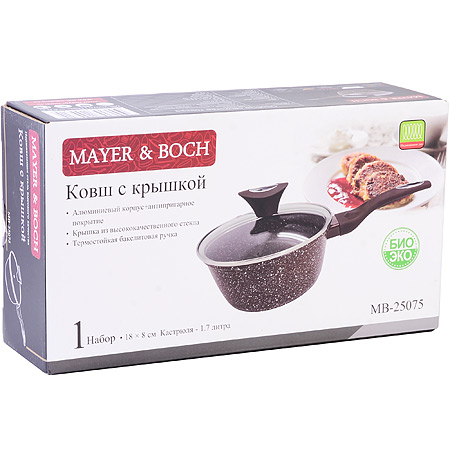 Ковш с крышкой от MAYER&BOCH – идеальное решение для приготовления вкусных и здоровых блюд. Ковш кухонный MAYER&BOCH диаметром 18 см - красивая и прочная штампованная алюминиевая посуда с антипригарным покрытием, что исключает возможность деформации и гарантирует долгий срок службы. Он не только является незаменимым в плане варки и тушения. Мраморное антипригарное покрытие позволяет готовить практически не используя масло, что значительно увеличивает полезность приготовляемой еды. У ковша толстые стенки и дно, благодаря чему происходит равномерный нагрев поверхности, тепло сохраняется дольше. Вы сможете приготовить без лишнего использования масла или жира, сохраняя при этом непревзойденный вкус и аромат вашей еды. Идеально подходит для приготовления разнообразных блюд – от супов и соусов до каши и пасты, плова, казан-кебаб, жаркое. Ковшик кухонный с толстым дном имеет бакелитовую ручку, которая не нагревается. Ковш с крышкой в комплекте из жаропрочного стекла, со стальным ободом и с пароотводом. Ковшики подходят для всех типов плит, включая индукционные. Ковш для индукционной плиты имеет утолщенное индукционное дно, которое обеспечивает идеальный контакт с конфоркой. Благодаря высокотехнологичному оборудованию, ковш алюминиевый безупречного качества и по доступной цене, соответствует стандартам качества и ГОСТ. Преимущества ковша с крышкой: объем 1,7 литра, прочный и долговечный, равномерное распределение тепла, экономия времени и сил, красивый дизайн. Ковшик прост в уходе: мечта каждой хозяйки, он легко моется и не требует специального ухода. Ковш с антипригарным покрытием имеет стильный дизайн с мраморным напылением прекрасно впишется в любой интерьер и станет украшением интерьера. Ковш с крышкой антипригарный MAYER&BOCH – это отличный подарок маме, бабушке, сестре, на Новый год, День рождения, 8 марта.