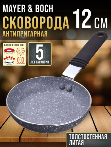 Самая вкусная еда — приготовленная с душой и любовью. С MAYER&BOCH и простые блюда, и кулинарные изыски получаются невероятно вкусными, сочными и неповторимыми. Пусть процесс готовки приносит вам истинное удовольствие, в этом вам поможет качественная глубокая сковорода 12 см. с антипригарным покрытием и эргономичной и термостойкой ручкой. В большой сковороде для кухни, на завтрак можно пожарить без масла блины, оладьи, панкейки или яичницу. Благодаря высоким стенкам легко потушить овощное рагу. А толстое индукционное дно — это идеальное решение для ваших кулинарных шедевров, позволит готовить самые вкусные и сочные стейки или котлеты. Удобная и универсальная сковородка из литого алюминия, идеально подходит для жарки и тушения на всех типах плит: газовой, индукционной, электрической, керамической, галогеновой. Керамическое покрытие из мраморной крошки, без вредных соединений и примесей, не даст блюду подгореть даже если готовить при сильном жаре. Ручка из бакелита не нагревается и не скользит в руке. Это незаменимый кухонный инвентарь для приготовления пиши. К тому же здорово поможет хозяйке сэкономить время. Ведь на ней практически не остается следов еды после готовки. Достаточно просто смахнуть остатки еды салфеткой, можно протереть губкой, легко моется под струей воды. Подходит для мытья в посудомоечной машине, при этом сохраняет свои антипригарные свойства. Для чистки также подойдет деликатное моющее средство и мягкая губка без абразивного слоя. Алюминиевая сковорода выполнена из высокотехнологичного материала, несмотря на свой легкий вес сковородка достаточно прочная, и не склонна к деформации даже при падении с высоты. Сделайте отличный подарок на день рождения или Новый год любимой маме, бабушке, сестре и подруге. Экспериментируйте и вдохновляйтесь новыми рецептами, а кухонные принадлежности от бренда MAYER&BOCH помогут воплотить даже самые смелые кулинарные фантазии!