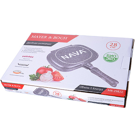 Сковорода MAYER&BOCH выполнена из качественного литого алюминия и снабжена антипригарным покрытием особой прочности. Больше не нужно переворачивать еду, теперь можно переворачивать всю сковороду целиком. Эргономичные ручки с магнитной защелкой для безопасного приготовления пищи и удобной переноски. Силиконовый уплотнитель не позволяет сокам вытечь или испариться, тем самым удерживая тепло и сохраняя вкус продуктов. Также в наборе идет запасная резинка. Антипригарное покрытие легко чистить даже без использования специальных моющих средств. Сковорода прекрасно подходит для приготовления мяса и рыбы, стейков, овощей и даже выпечки. Пищу можно готовить без использования растительного масла. При желании сковородка делится на две раздельные емкости одинаковой вместимости.