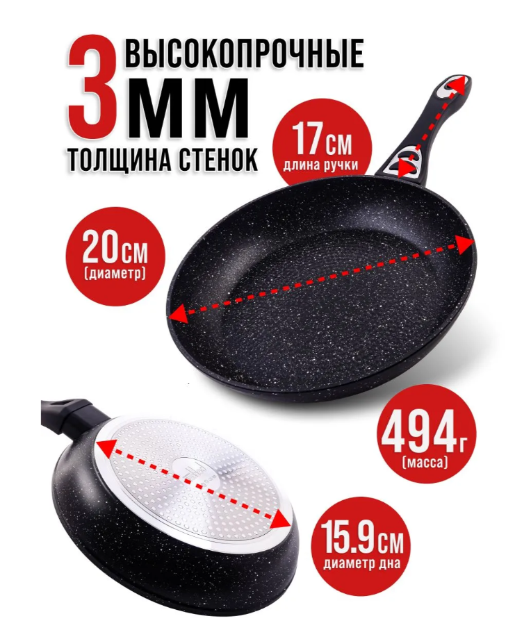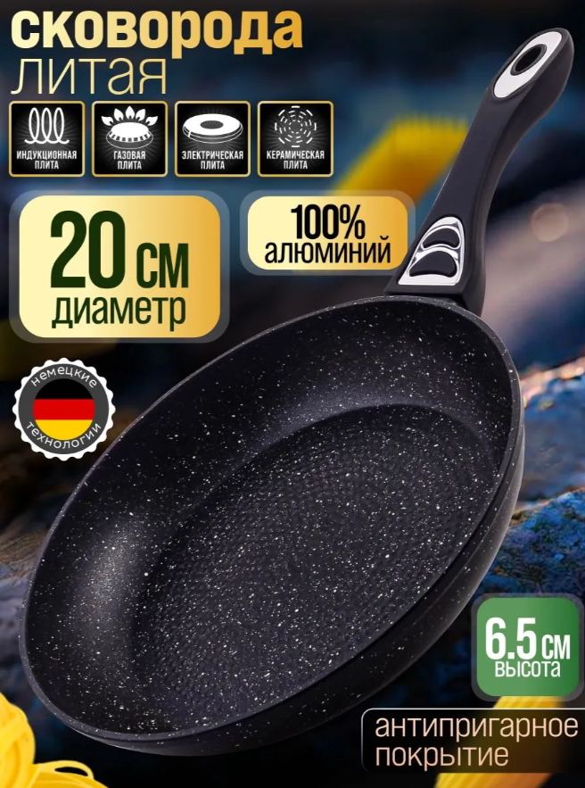 Сковорода станет вашим надёжным помощником на кухне, благодаря своим неповторимым особенностям и стильному дизайну. Внутри посуды 3-х слойное антипригарное покрытие из мраморной крошки, а снаружи 3-слойное жаропрочное покрытие, которые обеспечивают идеальное распределение тепла, предотвращают прилипание пищи и гарантирует, что каждое ваше блюдо будет иметь превосходный вкус и вид. Откройте для себя универсальность нашей сковороды антипригарной! Она идеально подходит для жарки и тушения, позволяя создавать разнообразные кулинарные шедевры. Высокие стенки сковороды 20 см позволяют тушить овощи и мяско, сохраняя их сочность и аромат. Толстое индукционное дно толщиной 3 мм позволяет готовить любые блюда, от нежных стейков до ароматных котлет, получая каждый раз безупречный результат. Рельеф на дне создаёт эффект гриля, позволяя продуктам соприкасаться с поверхностью лишь частично, что делает их сочными и нежирными. Также эта особенность способствует удалению излишков жира. Эргономичная бакелитовая ручка с покрытием Soft Touch не нагревается и не скользит в руке, обеспечивая комфорт и безопасность в процессе готовки. Легкость ухода порадует любую хозяйку: после использования достаточно просто смахнуть остатки еды салфеткой или протереть губкой, она легко моется под струей воды и подходит для мытья в посудомоечной машине. Сковородка устойчива к деформациям, не теряет своих антипригарных свойств и служит долго, что делает их надежным выбором для ежедневного использования. Многофункциональность этой модели позволяет использовать её на разных типах плит: газовых, электрических, керамических и индукционных. С этой уникальной сковородой для индукционной плиты каждая ваша трапеза станет настоящим праздником вкуса. Она станет прекрасным подарком для любой ценительницы качества и комфорта на кухне. С нашей посудой для кухни ваши кулинарные эксперименты станут удивительными и незабываемыми.