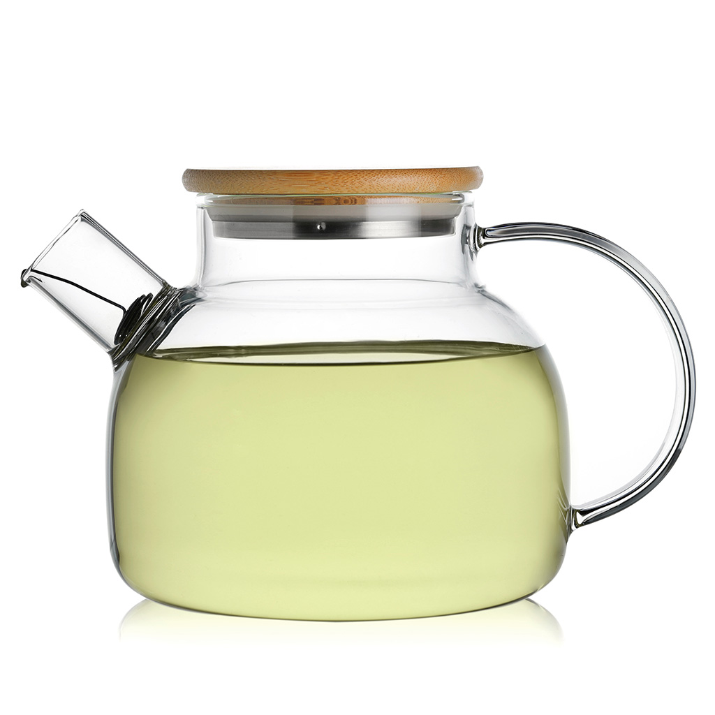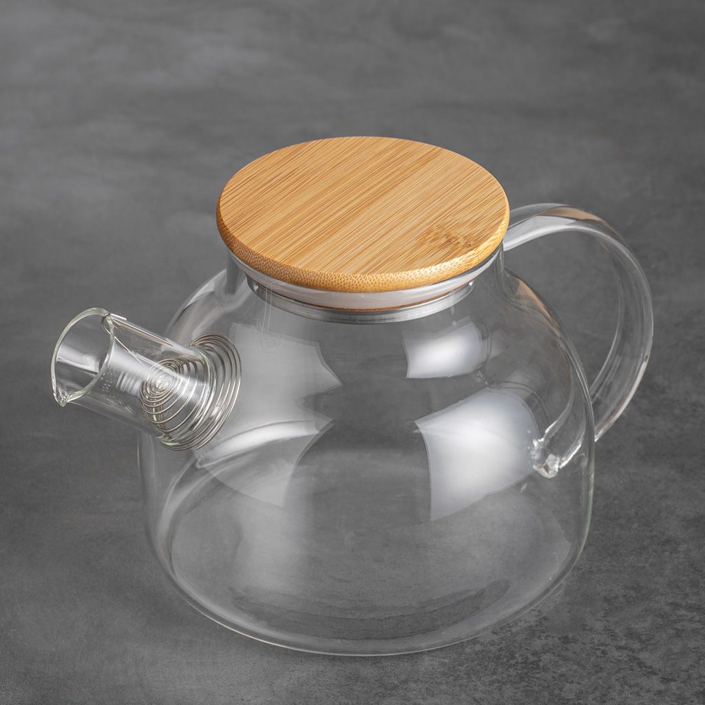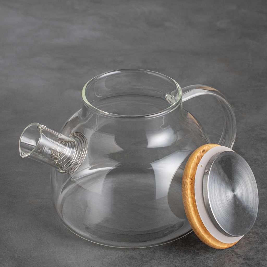 Заварочный чайник грушевидной формы, с коротким цилиндрическим носиком с пружинкой, широкой С-образной ручкой, из жаропрочного стекла, объем 900 мл. Крышка деревянная, снизу окованная металлом с силиконовым ободком.