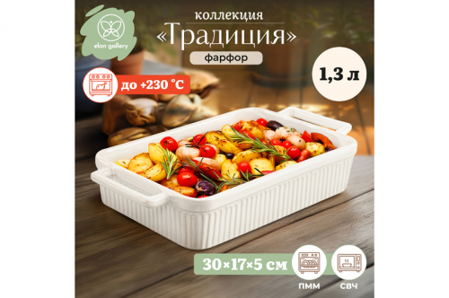 Форма для запекания Elan Gallery "Традиция..показать" объемом 1,3 литра выполнена из фарфора. Размер 30,5×17,2×5,5 см. Внутренний размер 24,2х15,8х4,8 см. Размер без ручек 25,2х17,2х5,5 см, размер дна 24х16,4 см. Фарфоровая ёмкость мятного цвета подходит для выпекания в духовке и подачи готового блюда на стол в той же форме. В ней получится чудесная лазанья или выпечка. "Традиция" – это коллекция посуды для запекания, вдохновлённая уютом домашней кухни. Мягкие очертания, нежные оттенки и рельефные узоры навевают атмосферу безмятежности и пробуждают светлые воспоминания. Изделия созданы для любимых блюд по семейным рецептам, которые собирают близких за одним столом. Глубокая тарелка прямоугольной формы удобна для приготовления различных кулинарных шедевров: мясных и овощных запеканок, а также пирога и заливного. Блюдо нежного зелёного цвета станет универсальным предметом на кухне: можно использовать для приготовления и сервировки еды. Испеките нежный десерт из творога, а также приготовьте чизкейк, кекс или бисквит. Любители кондитерских изделий оценят удобство при создании творожной выпечки или тирамису. Используйте как контейнер для хранения остатков еды, прикрыв фольгой, либо в роли сервировочного лотка для подачи закусок, хлеба и горячих блюд из мяса и рыбы. Можно использовать как шубницу – для приготовления классической селёдки под шубой или подачи салата. Инструкция: не рекомендуется применять абразивные моющие средства. Избегать резких перепадов температур и механических повреждений. Можно использовать в микроволновой печи, посудомоечной машине и духовом шкафу при температуре до 230 градусов. Запрещено использовать на плите и открытом огне. Кухонный инвентарь станет полезным подарком на праздник. Поставляется в стильной картонной коробке. Благодаря красочной коробочке не понадобится подарочная упаковка, если вы решите сделать сюрприз. В коллекции бренда Элан Галерея представлено много кухонной утвари и других товаров для дома. Выберите вариант на свой вкус!" объемом 1,3 литра выполнена из фарфора. Размер 30,5×17,2×5,5 см. Внутренний размер 24,2х15,8х4,8 см. Размер без ручек 25,2х17,2х5,5 см, размер дна 24х16,4 см. Фарфоровая ёмкость мятного цвета подходит для выпекания в духовке и подачи готового блюда на стол в той же форме. В ней получится чудесная лазанья или выпечка. "Традиция" – это коллекция посуды для запекания, вдохновлённая уютом домашней кухни. Мягкие очертания, нежные оттенки и рельефные узоры навевают атмосферу безмятежности и пробуждают светлые воспоминания. Изделия созданы для любимых блюд по семейным рецептам, которые собирают близких за одним столом. Глубокая тарелка прямоугольной формы удобна для приготовления различных кулинарных шедевров: мясных и овощных запеканок, а также пирога и заливного. Блюдо нежного зелёного цвета станет универсальным предметом на кухне: можно использовать для приготовления и сервировки еды. Испеките нежный десерт из творога, а также приготовьте чизкейк, кекс или бисквит. Любители кондитерских изделий оценят удобство при создании творожной выпечки или тирамису. Используйте как контейнер для хранения остатков еды, прикрыв фольгой, либо в роли сервировочного лотка для подачи закусок, хлеба и горячих блюд из мяса и рыбы. Можно использовать как шубницу – для приготовления классической селёдки под шубой ил