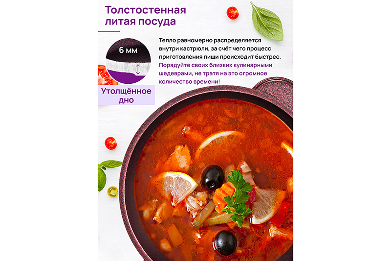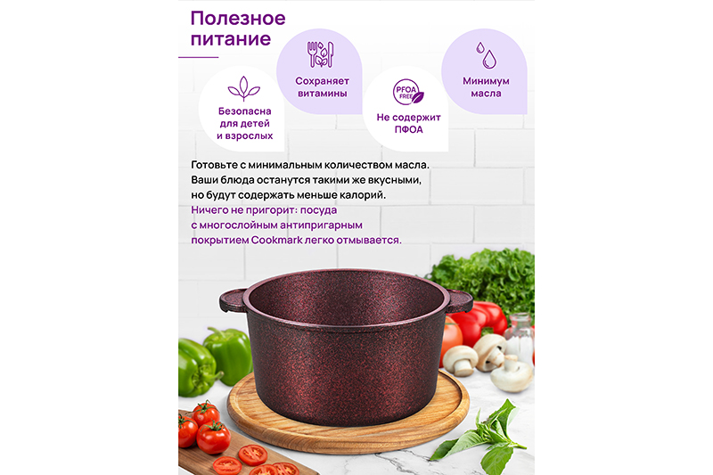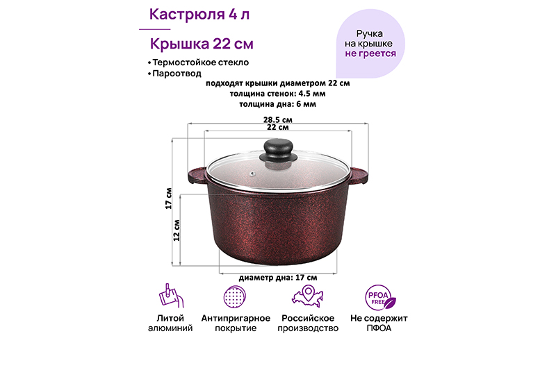 Кастрюля Elan Gallery "Гранат" из сер..показатьии "Гармония вкуса" объёмом 4 литра с крышкой равномерно разогревается и распределяет тепло таким образом, что продукты в ней остаются сочными и сохраняют все полезные свойства и аромат. Диаметр стеклянной крышки – 22 см, диаметр дна – 17 см. Кастрюля с прозрачной крышкой выполнена из толстостенного литого алюминия и имеет ультрапрочное двухслойное антипригарное покрытие Cookmark. Покрытие устойчиво к царапинам и износу, полностью безопасно для здоровья и не содержит PFOA или других вредных веществ. Крышка изготовлена из жаропрочного стекла и имеет пароотвод. Алюминиевая кастрюлька с толстыми дном и стенками выполнена в стильном дизайне и позволит приготовить дома суп, кашу, плов или любой гарнир. Порадуйте близких супом с фрикадельками, борщом или куриной лапшой. Удобна для приготовления пасты, так как макаронные изделия не будут прилипать на дно благодаря антипригарной поверхности. Суповая кастрюля подойдёт для тушения и варки блюд из мяса, рыбы и овощей. Эксплуатация: кухонную утварь не нагревать без продуктов. Дайте посуде остыть, прежде чем помещать ее в воду. Использовать только деревянные и силиконовые приборы. Не мыть абразивными или щелочными моющими средствами. Использовать в ПММ только в режиме "Эко" с применением средств, не содержащих щелочи. Подходит для стеклокерамических, газовых и электрических плит. Не подходит для индукционных плит! Без крышки можно использовать в духовой печи при температуре до 250 градусов. Теперь для использования в духовке не понадобится отдельная ёмкость. Кастрюля станет полезным подарком на любой праздник и придаст процессу приготовления пищи новый уровень комфорта. В серии "Гармония вкуса" вы найдёте любой кухонный инвентарь. Соберите набор для вашей кухни или столовой в едином стиле!ии "Гармония вкуса" объёмом 4 литра с крышкой равномерно разогревается и распределяет тепло таким образом, что продукты в ней остаются сочными и сохраняют все полезные свойства и аромат. Диаметр стеклянной крышки – 22 см, диаметр дна – 17 см. Кастрюля с прозрачной крышкой выполнена из толстостенного литого алюминия и имеет ультрапрочное двухслойное антипригарное покрытие Cookmark. Покрытие устойчиво к царапинам и износу, полностью безопасно для здоровья и не содержит PFOA или других вредных веществ. Крышка изготовлена из жаропрочного стекла и имеет пароотвод. Алюминиевая кастрюлька с толстыми дном и стенками выполнена в стильном дизайне и позволит приготовить дома суп, кашу, плов или любой гарнир. Порадуйте близких супом с фрикадельками, борщом или куриной лапшой. Удобна для приготовления пасты, так как макаронные изделия не будут прилипать на дно благодаря антипригарной поверхности. Суповая кастрюля подойдёт для тушения и варки блюд из мяса, рыбы и овощей. Эксплуатация: кухонную утварь не нагревать без продуктов. Дайте посуде остыть, прежде чем помещать ее в воду. Использовать только деревянные и силиконовые приборы. Не мыть абразивными или щелочными моющими средствами. Использовать в ПММ только в режиме "Эко" с применением средств, не содержащих щелочи. Подходит для стеклокерамических, газовых и электрических плит. Не подходит для индукционных плит! Без крышки можно использовать в духовой печи при температуре до 250 градусов. Теперь для использования в духовке не п