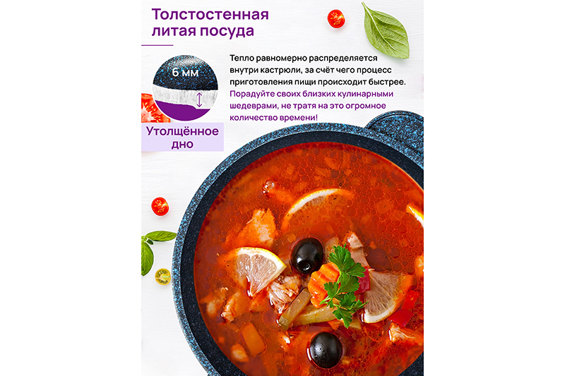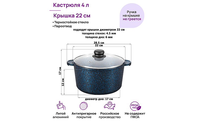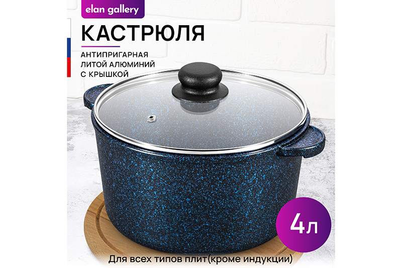 Кастрюля Elan Gallery "Сапфир" из сер..показатьии "Гармония вкуса" объёмом 4 литра с крышкой равномерно разогревается и распределяет тепло таким образом, что продукты в ней остаются сочными и сохраняют все полезные свойства и аромат. Диаметр стеклянной крышки – 22 см, диаметр дна – 17 см. Кастрюля с прозрачной крышкой выполнена из толстостенного литого алюминия и имеет ультрапрочное двухслойное антипригарное покрытие Cookmark. Покрытие устойчиво к царапинам и износу, полностью безопасно для здоровья и не содержит PFOA или других вредных веществ. Крышка изготовлена из жаропрочного стекла и имеет пароотвод. Алюминиевая кастрюлька с толстыми дном и стенками выполнена в стильном дизайне и позволит приготовить дома суп, кашу, плов или любой гарнир. Порадуйте близких супом с фрикадельками, борщом или куриной лапшой. Удобна для приготовления пасты, так как макаронные изделия не будут прилипать на дно благодаря антипригарной поверхности. Суповая кастрюля подойдёт для тушения и варки блюд из мяса, рыбы и овощей. Эксплуатация: кухонную утварь не нагревать без продуктов. Дайте посуде остыть, прежде чем помещать ее в воду. Использовать только деревянные и силиконовые приборы. Не мыть абразивными или щелочными моющими средствами. Использовать в ПММ только в режиме "Эко" с применением средств, не содержащих щелочи. Подходит для стеклокерамических, газовых и электрических плит. Не подходит для индукционных плит! Без крышки можно использовать в духовой печи при температуре до 250 градусов. Теперь для использования в духовке не понадобится отдельная ёмкость. Кастрюля станет полезным подарком на любой праздник и придаст процессу приготовления пищи новый уровень комфорта. В серии "Гармония вкуса" вы найдёте любой кухонный инвентарь. Соберите набор для вашей кухни или столовой в едином стиле!ии "Гармония вкуса" объёмом 4 литра с крышкой равномерно разогревается и распределяет тепло таким образом, что продукты в ней остаются сочными и сохраняют все полезные свойства и аромат. Диаметр стеклянной крышки – 22 см, диаметр дна – 17 см. Кастрюля с прозрачной крышкой выполнена из толстостенного литого алюминия и имеет ультрапрочное двухслойное антипригарное покрытие Cookmark. Покрытие устойчиво к царапинам и износу, полностью безопасно для здоровья и не содержит PFOA или других вредных веществ. Крышка изготовлена из жаропрочного стекла и имеет пароотвод. Алюминиевая кастрюлька с толстыми дном и стенками выполнена в стильном дизайне и позволит приготовить дома суп, кашу, плов или любой гарнир. Порадуйте близких супом с фрикадельками, борщом или куриной лапшой. Удобна для приготовления пасты, так как макаронные изделия не будут прилипать на дно благодаря антипригарной поверхности. Суповая кастрюля подойдёт для тушения и варки блюд из мяса, рыбы и овощей. Эксплуатация: кухонную утварь не нагревать без продуктов. Дайте посуде остыть, прежде чем помещать ее в воду. Использовать только деревянные и силиконовые приборы. Не мыть абразивными или щелочными моющими средствами. Использовать в ПММ только в режиме "Эко" с применением средств, не содержащих щелочи. Подходит для стеклокерамических, газовых и электрических плит. Не подходит для индукционных плит! Без крышки можно использовать в духовой печи при температуре до 250 градусов. Теперь для использования в духовке не п