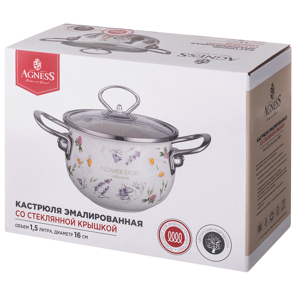 КАСТРЮЛЯ AGNESS ЭМАЛИРОВАННАЯ СО СТЕКЛЯННОЙ КРЫШКОЙ СЕРИЯ "FLOWER STORY", 1,5 Л ДИА. 16СМ