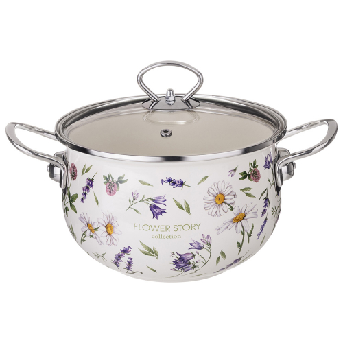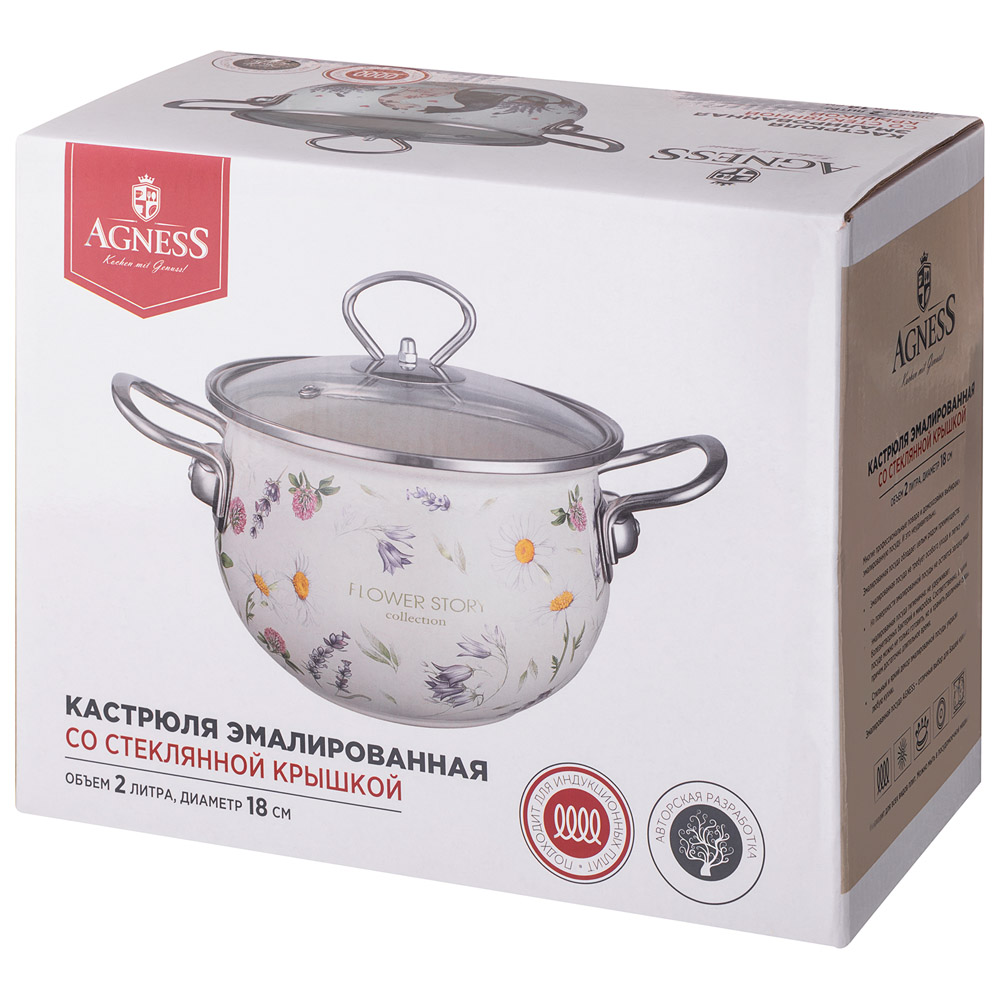 КАСТРЮЛЯ AGNESS ЭМАЛИРОВАННАЯ СО СТЕКЛЯННОЙ КРЫШКОЙ СЕРИЯ "FLOWER STORY", 2,0 Л ДИА. 18СМ