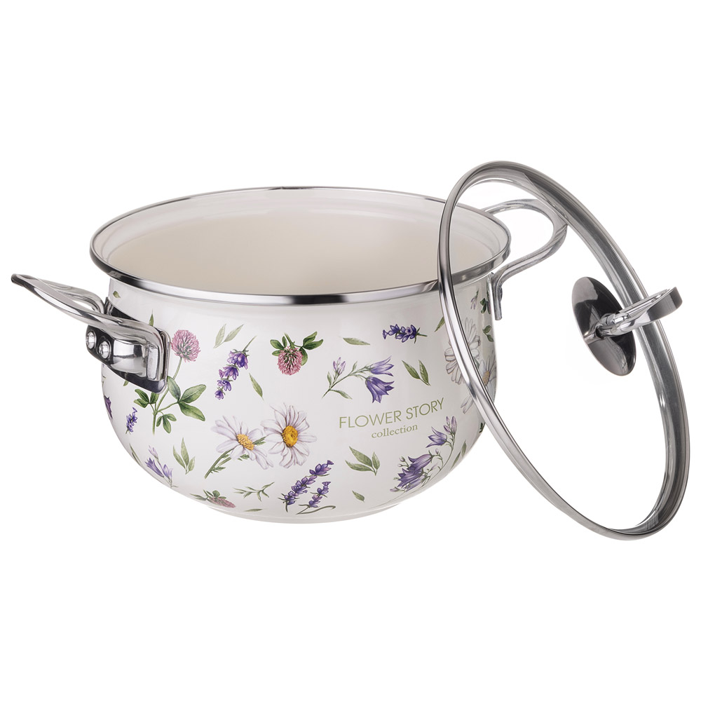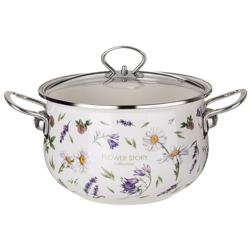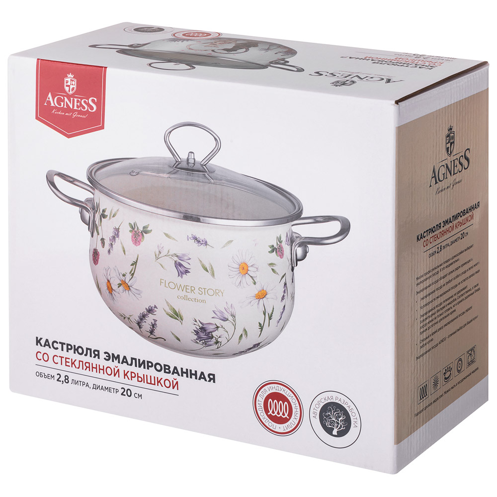 КАСТРЮЛЯ AGNESS ЭМАЛИРОВАННАЯ СО СТЕКЛЯННОЙ КРЫШКОЙ СЕРИЯ "FLOWER STORY", 2,8 Л ДИА. 20СМ