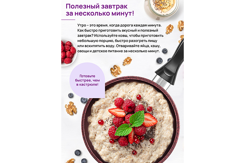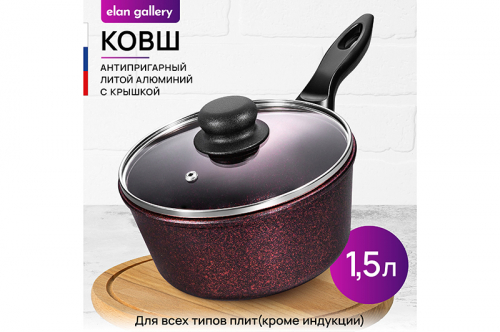 Ковш Elan Gallery "Гранат" из серии &..показатьquot;Гармония вкуса" объемом 1,5 литра с крышкой равномерно разогревается и распределяет тепло таким образом, что продукты в нем остаются сочными и сохраняют все свои полезные и вкусовые свойства. Диаметр крышки – 18 см, диаметр дна – 12 см. Ковшик выполнен из толстостенного литого алюминия и имеет ультрапрочное двухслойное антипригарное покрытие Cookmark. Покрытие устойчиво к царапинам и износу, полностью безопасно для здоровья и не содержит PFOA или других вредных веществ. Выполнен в стильном дизайне. Плотная крышка изготовлена из жаропрочного стекла и имеет пароотвод. Удобная ручка обеспечивает возможность быстрой подачи приготовленной пищи на стол. Идеально подойдет для варки каши на завтрак, а также позволит быстро разогревать молоко, суп и любой гарнир. Эксплуатация: не нагревать без продуктов. Дайте посуде остыть, прежде чем помещать ее в воду. Использовать только деревянные и силиконовые приборы. Не мыть абразивными или щелочными моющими средствами. Использовать в посудомоечной машине только в режиме "Эко" с применением средств, не содержащих щелочи. Подходит для всех типов плит, кроме индукционных. Ковш станет полезным подарком на праздник и придаст процессу приготовления пищи новый уровень комфорта. В серии "Гармония вкуса" вы найдёте различную кухонную утварь. Соберите набор для вашей кухни в едином стиле!quot;Гармония вкуса" объемом 1,5 литра с крышкой равномерно разогревается и распределяет тепло таким образом, что продукты в нем остаются сочными и сохраняют все свои полезные и вкусовые свойства. Диаметр крышки – 18 см, диаметр дна – 12 см. Ковшик выполнен из толстостенного литого алюминия и имеет ультрапрочное двухслойное антипригарное покрытие Cookmark. Покрытие устойчиво к царапинам и износу, полностью безопасно для здоровья и не содержит PFOA или других вредных веществ. Выполнен в стильном дизайне. Плотная крышка изготовлена из жаропрочного стекла и имеет пароотвод. Удобная ручка обеспечивает возможность быстрой подачи приготовленной пищи на стол. Идеально подойдет для варки каши на завтрак, а также позволит быстро разогревать молоко, суп и любой гарнир. Эксплуатация: не нагревать без продуктов. Дайте посуде остыть, прежде чем помещать ее в воду. Использовать только деревянные и силиконовые приборы. Не мыть абразивными или щелочными моющими средствами. Использовать в посудомоечной машине только в режиме "Эко" с применением средств, не содержащих щелочи. Подходит для всех типов плит, кроме индукционных. Ковш станет полезным подарком на праздник и придаст процессу приготовления пищи новый уровень комфорта. В серии "Гармония вкуса" вы найдёте различную кухонную утварь. Соберите набор для вашей кухни в едином стиле!