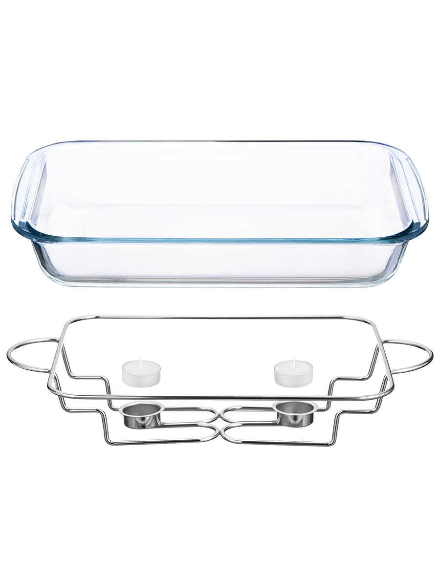 Набор 2 прямоугольных мармитов с крышками от бр..показатьенда Elan Gallery – это элегантное решение для подачи тёплых блюд на стол. Общий размер комплекта – 48х29,8х17 см. Объём каждой жаропрочной ёмкости – 1,5 литра, размер каждой – 29,5х17,5х5 см. Внутренний размер каждого блюда 25,5х16х4 см. Красивая сервировочная посуда сочетает в себе функциональность и изысканный дизайн: снизу ёмкости подогреваются двумя свечами (поставляются в комплекте), чтобы поддерживать температуру пищи. Формы выполнены из жаропрочного стекла, крышки и подставка – из нержавеющей стали. Размер металлической подставки – 47,8х28х9,5 см (внутренний размер 36х27х9,3 см). Внутренний диаметр каждой подставки для свечи – 4 см. Круглые формочки для свечей с подставки не снимаются. Подставка устойчива и легко сочетается с любым стилем столовой или кухни. Подогрев с помощью свечи создает мягкое, равномерное тепло – идеально для подачи шашлыка, горячих закусок или гарниров на фуршете. Прозрачные стенки подчёркивают аппетитный вид блюд, презентуя их для семьи и гостей. Используйте для красивой сервировки вторых блюд: рыбы, мяса или запечённого картофеля со сметаной и зеленью. Мармитница – это стильный кухонный инвентарь как для повседневного использования, так и праздничного стола. Не рекомендуется применять абразивные моющие средства. Каждую ёмкость можно использовать в роли формы для запекания в духовой печи при температуре 230 градусов (в том числе вместе с крышкой). Можно мыть в посудомоечной машине. Без крышки и подставки стеклянные тарелки можно использовать в микроволновой печи. Набор поставляется в стильной картонной коробке. Благодаря красивой коробочке не понадобится подарочная упаковка, если вы решите сделать подарок на праздник. В коллекции бренда Элан Галерея представлены товары для дома и стильная посуда, выберите вариант на свой вкус!енда Elan Gallery – это элегантное решение для подачи тёплых блюд на стол. Общий размер комплекта – 48х29,8х17 см. Объём каждой жаропрочной ёмкости – 1,5 литра, размер каждой – 29,5х17,5х5 см. Внутренний размер каждого блюда 25,5х16х4 см. Красивая сервировочная посуда сочетает в себе функциональность и изысканный дизайн: снизу ёмкости подогреваются двумя свечами (поставляются в комплекте), чтобы поддерживать температуру пищи. Формы выполнены из жаропрочного стекла, крышки и подставка – из нержавеющей стали. Размер металлической подставки – 47,8х28х9,5 см (внутренний размер 36х27х9,3 см). Внутренний диаметр каждой подставки для свечи – 4 см. Круглые формочки для свечей с подставки не снимаются. Подставка устойчива и легко сочетается с любым стилем столовой или кухни. Подогрев с помощью свечи создает мягкое, равномерное тепло – идеально для подачи шашлыка, горячих закусок или гарниров на фуршете. Прозрачные стенки подчёркивают аппетитный вид блюд, презентуя их для семьи и гостей. Используйте для красивой сервировки вторых блюд: рыбы, мяса или запечённого картофеля со сметаной и зеленью. Мармитница – это стильный кухонный инвентарь как для повседневного использования, так и праздничного стола. Не рекомендуется применять абразивные моющие средства. Каждую ёмкость можно использовать в роли формы для запекания в духовой печи при температуре 230 градусов (в том числе вместе с крышкой). Можно мыть в посудомоечной машине. Без крышки и подставки стеклянные та