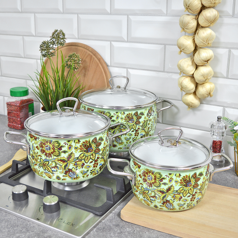 Набор кастрюль "Imperio" №02 салатовыйКастрюли подходят для приготовления супов, гарниров или компотов.Качественное эмалированное покрытие безопасно для пищевых продуктов.Кастрюли имеют удобные ручки и стеклянные крышки.Подходят для всех типов плит, в том числе индукционных.Состав набора:• кастрюля 2л, размер - 26х18х12 см• кастрюля 3л, размер - 28х20х12 см• кастрюля 4л, размер - 30х22х14 смВысота кастрюль указана без учета крышки.Заключаем договора по 44 ФЗ, 223 ФЗ