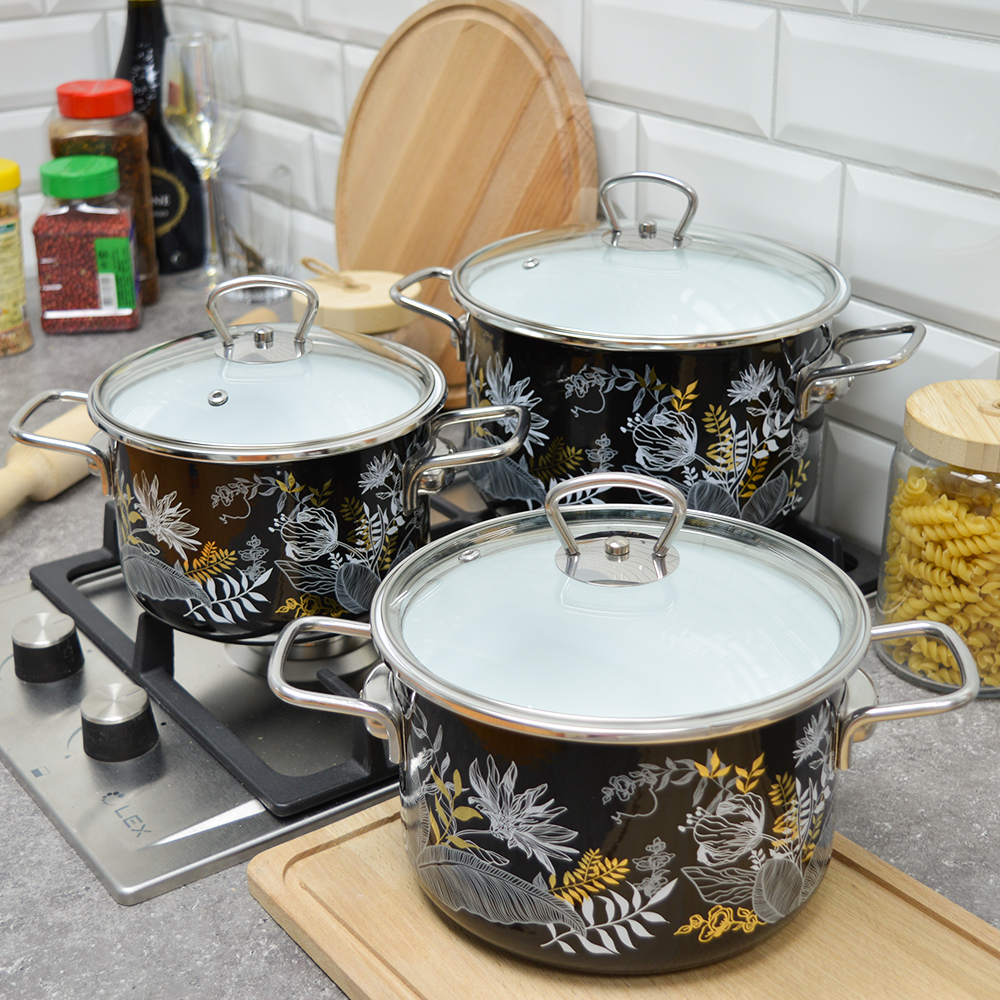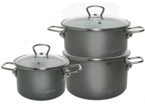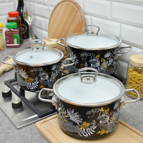 Набор кастрюль "Magia" №02 черныйКастрюли подходят для приготовления супов, гарниров или компотов.Качественное эмалированное покрытие безопасно для пищевых продуктов.Кастрюли имеют удобные ручки и стеклянные крышки.Подходят для всех типов плит, в том числе индукционных.Состав набора:• кастрюля 2л, размер - 26х18х12 см• кастрюля 3л, размер - 28х20х12 см• кастрюля 4л, размер - 30х22х14 смВысота кастрюль указана без учета крышки.Заключаем договора по 44 ФЗ, 223 ФЗ