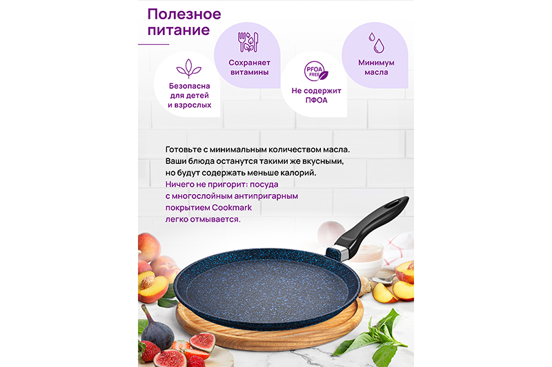 Сковорода блинная Elan Gallery "Сапфир&quo..показатьt; из серии "Гармония вкуса" диаметром 26 см равномерно разогревается и распределяет тепло таким образом, чтобы продукты сохраняли все свои полезные и вкусовые свойства. Сковорода изготовлена из литого алюминия и имеет ультрапрочное двухслойное антипригарное покрытие Cookmark. Оно защищает блинчики от пригорания и позволяет переворачивать их лопаткой без особого труда. Диаметр дна 24 см. Выполнена в стильном дизайне. Покрытие устойчиво к царапинам и износу, полностью безопасно для здоровья и не содержит PFOA или других вредных веществ. Готовьте блины идеальной формы на завтрак и радуйте ими своих близких! Эксплуатация: не нагревать без продуктов. Дайте посуде остыть, прежде чем помещать ее в воду. Использовать только деревянные и силиконовые приборы. Не мыть абразивными или щелочными моющими средствами. Использовать в посудомоечной машине только в режиме "Эко" с применением средств, не содержащих щелочи. Подходит для всех типов плит, кроме индукционных. Блинница станет идеальным подарком на любой праздник и придаст процессу приготовления пищи новый уровень комфорта. Подарите универсальную кухонную утварь своим близким. Хорошая блинная сковородка – мечта любой хозяйки! В серии "Гармония вкуса" вы найдёте любые кухонные принадлежности и инвентарь для вашего дома. Соберите набор для вашей кухни в едином стиле!t; из серии "Гармония вкуса" диаметром 26 см равномерно разогревается и распределяет тепло таким образом, чтобы продукты сохраняли все свои полезные и вкусовые свойства. Сковорода изготовлена из литого алюминия и имеет ультрапрочное двухслойное антипригарное покрытие Cookmark. Оно защищает блинчики от пригорания и позволяет переворачивать их лопаткой без особого труда. Диаметр дна 24 см. Выполнена в стильном дизайне. Покрытие устойчиво к царапинам и износу, полностью безопасно для здоровья и не содержит PFOA или других вредных веществ. Готовьте блины идеальной формы на завтрак и радуйте ими своих близких! Эксплуатация: не нагревать без продуктов. Дайте посуде остыть, прежде чем помещать ее в воду. Использовать только деревянные и силиконовые приборы. Не мыть абразивными или щелочными моющими средствами. Использовать в посудомоечной машине только в режиме "Эко" с применением средств, не содержащих щелочи. Подходит для всех типов плит, кроме индукционных. Блинница станет идеальным подарком на любой праздник и придаст процессу приготовления пищи новый уровень комфорта. Подарите универсальную кухонную утварь своим близким. Хорошая блинная сковородка – мечта любой хозяйки! В серии "Гармония вкуса" вы найдёте любые кухонные принадлежности и инвентарь для вашего дома. Соберите набор для вашей кухни в едином стиле!