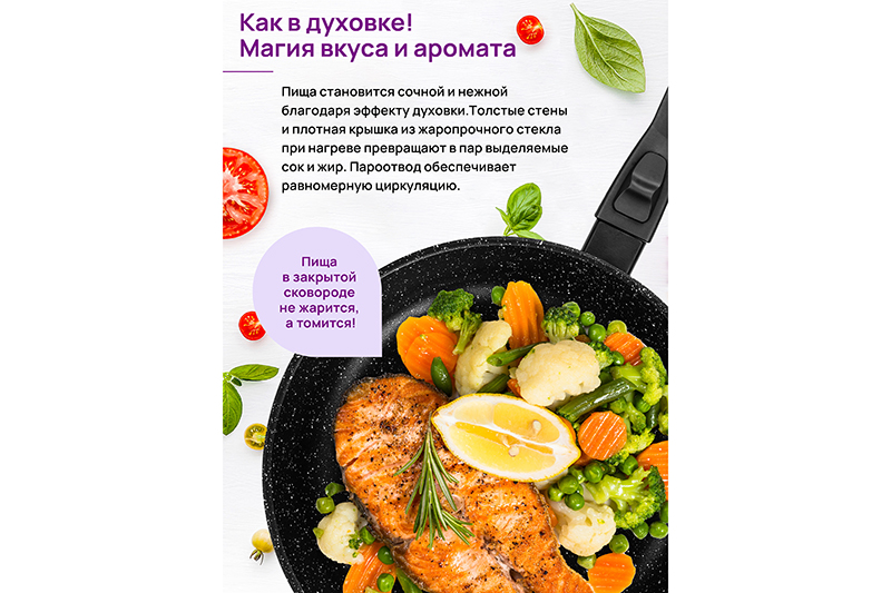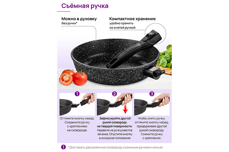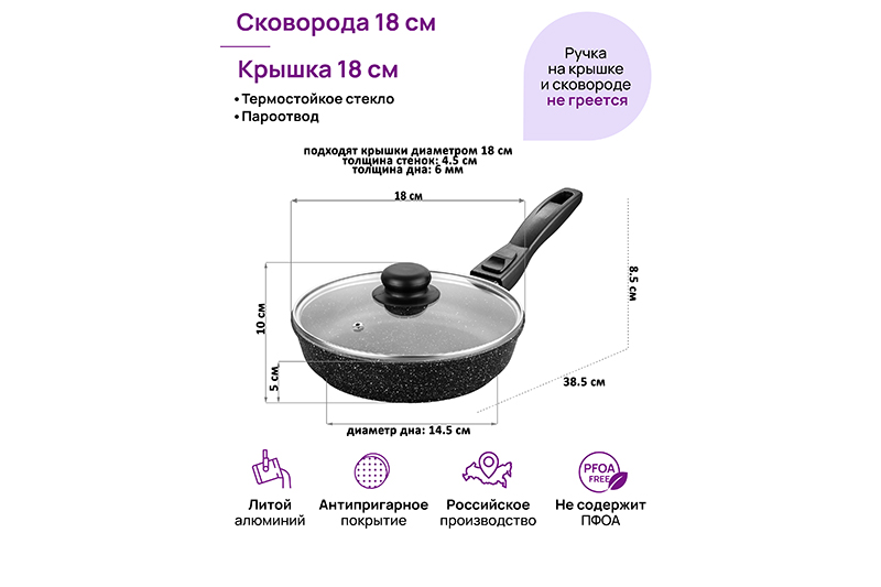 Глубокая сковорода Elan Gallery "Чёрный мр..показатьамор" с крышкой и съёмной ручкой из серии "Гармония вкуса" диаметром 18 см равномерно разогревается и распределяет тепло, поэтому продукты в ней сохраняют полезные свойства и сочность. Диаметр дна — 14,5 см. Длина ручки 20 см. Стильный дизайн подойдет к любому интерьеру кухни. Подходит для приготовления стейков из рыбы, мяса или блюд из овощей. Маленькая сковорода с глубоким дном выполнена из толстостенного литого алюминия и имеет ультрапрочное двухслойное антипригарное покрытие Cookmark. Оно устойчиво к царапинам и износу, безопасно для здоровья и не содержит PFOA или других вредных веществ. Используйте для жарки котлет или картофеля с минимальным количеством масла. Здоровую пищу оценит любой гурман! Готовьте на завтрак оладьи или блюда из яиц: яичницу, омлет. Порадуйте близких блинами на Масленицу, ни один блинчик не подгорит. Алюминиевая сковородка с толстым дном имеет удобную ручку, которая обеспечивает надежный захват при подаче еды с плиты на стол. Без крышки и ручки можно использовать в духовом шкафу как форму для запекания при температуре до 250°C. Не использовать съёмную ручку, чтобы достать раскалённую сковороду из духовой печи! Эксплуатация: не нагревать без продуктов. Дайте посуде остыть, прежде чем помещать ее в воду. Использовать только деревянные, силиконовые и пластиковые лопатки без острых краёв. Не мыть абразивными или щелочными моющими средствами. Использовать в ПММ в режиме "Эко" со средством, не содержащим щёлочи. Подходит для стеклокерамических, газовых и электрических плит. Не подходит для индукционных плит. Кухонная утварь станет приятным подарком на любой праздник и придаст процессу приготовления пищи комфорта. Хорошая сковорода – мечта любой хозяйки! Сковородка станет незаменимым инвентарем на вашей кухне и наполнит процесс приготовления пищи удовольствием!амор" с крышкой и съёмной ручкой из серии "Гармония вкуса" диаметром 18 см равномерно разогревается и распределяет тепло, поэтому продукты в ней сохраняют полезные свойства и сочность. Диаметр дна — 14,5 см. Длина ручки 20 см. Стильный дизайн подойдет к любому интерьеру кухни. Подходит для приготовления стейков из рыбы, мяса или блюд из овощей. Маленькая сковорода с глубоким дном выполнена из толстостенного литого алюминия и имеет ультрапрочное двухслойное антипригарное покрытие Cookmark. Оно устойчиво к царапинам и износу, безопасно для здоровья и не содержит PFOA или других вредных веществ. Используйте для жарки котлет или картофеля с минимальным количеством масла. Здоровую пищу оценит любой гурман! Готовьте на завтрак оладьи или блюда из яиц: яичницу, омлет. Порадуйте близких блинами на Масленицу, ни один блинчик не подгорит. Алюминиевая сковородка с толстым дном имеет удобную ручку, которая обеспечивает надежный захват при подаче еды с плиты на стол. Без крышки и ручки можно использовать в духовом шкафу как форму для запекания при температуре до 250°C. Не использовать съёмную ручку, чтобы достать раскалённую сковороду из духовой печи! Эксплуатация: не нагревать без продуктов. Дайте посуде остыть, прежде чем помещать ее в воду. Использовать только деревянные, силиконовые и пластиковые лопатки без острых краёв. Не мыть абразивными или щелочными моющими средствами. Использовать в ПММ в режиме "Эко" со средством, н