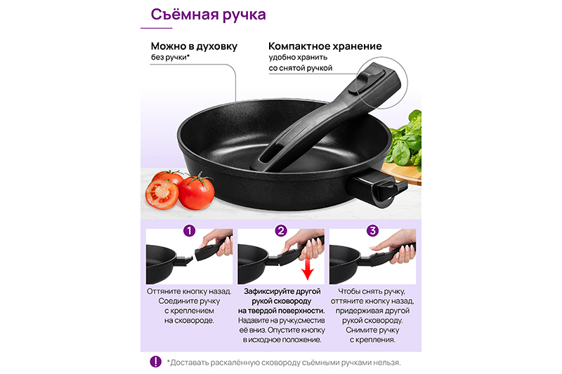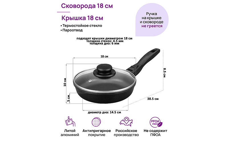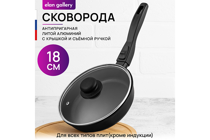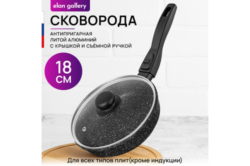 Глубокая сковорода Elan Gallery "Чёрный он..показатьикс" с крышкой и съёмной ручкой из серии "Гармония вкуса" диаметром 18 см равномерно разогревается и распределяет тепло, поэтому продукты в ней сохраняют полезные свойства и сочность. Диаметр дна — 14,5 см. Длина ручки 20 см. Стильный дизайн подойдет к любому интерьеру кухни. Подходит для приготовления стейков из рыбы, мяса или блюд из овощей. Маленькая сковорода с глубоким дном выполнена из толстостенного литого алюминия и имеет ультрапрочное двухслойное антипригарное покрытие Cookmark. Оно устойчиво к царапинам и износу, безопасно для здоровья и не содержит PFOA или других вредных веществ. Используйте для жарки котлет или картофеля с минимальным количеством масла. Здоровую пищу оценит любой гурман! Готовьте на завтрак оладьи или блюда из яиц: яичницу, омлет. Порадуйте близких блинами на Масленицу, ни один блинчик не подгорит. Алюминиевая сковородка с толстым дном имеет удобную ручку, которая обеспечивает надежный захват при подаче еды с плиты на стол. Без крышки и ручки можно использовать в духовом шкафу как форму для запекания при температуре до 250°C. Не использовать съёмную ручку, чтобы достать раскалённую сковороду из духовой печи! Эксплуатация: не нагревать без продуктов. Дайте посуде остыть, прежде чем помещать ее в воду. Использовать только деревянные, силиконовые и пластиковые лопатки без острых краёв. Не мыть абразивными или щелочными моющими средствами. Использовать в ПММ в режиме "Эко" со средством, не содержащим щёлочи. Подходит для стеклокерамических, газовых и электрических плит. Не подходит для индукционных плит. Кухонная утварь станет приятным подарком на любой праздник и придаст процессу приготовления пищи комфорта. Хорошая сковорода – мечта любой хозяйки! Сковородка станет незаменимым инвентарем на вашей кухне и наполнит процесс приготовления пищи удовольствием!икс" с крышкой и съёмной ручкой из серии "Гармония вкуса" диаметром 18 см равномерно разогревается и распределяет тепло, поэтому продукты в ней сохраняют полезные свойства и сочность. Диаметр дна — 14,5 см. Длина ручки 20 см. Стильный дизайн подойдет к любому интерьеру кухни. Подходит для приготовления стейков из рыбы, мяса или блюд из овощей. Маленькая сковорода с глубоким дном выполнена из толстостенного литого алюминия и имеет ультрапрочное двухслойное антипригарное покрытие Cookmark. Оно устойчиво к царапинам и износу, безопасно для здоровья и не содержит PFOA или других вредных веществ. Используйте для жарки котлет или картофеля с минимальным количеством масла. Здоровую пищу оценит любой гурман! Готовьте на завтрак оладьи или блюда из яиц: яичницу, омлет. Порадуйте близких блинами на Масленицу, ни один блинчик не подгорит. Алюминиевая сковородка с толстым дном имеет удобную ручку, которая обеспечивает надежный захват при подаче еды с плиты на стол. Без крышки и ручки можно использовать в духовом шкафу как форму для запекания при температуре до 250°C. Не использовать съёмную ручку, чтобы достать раскалённую сковороду из духовой печи! Эксплуатация: не нагревать без продуктов. Дайте посуде остыть, прежде чем помещать ее в воду. Использовать только деревянные, силиконовые и пластиковые лопатки без острых краёв. Не мыть абразивными или щелочными моющими средствами. Использовать в ПММ в режиме "Эко" со средством, не 