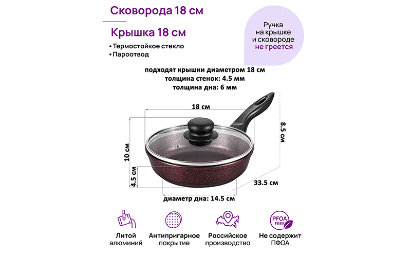 Глубокая сковорода Elan Gallery "Гранат&qu..показатьot; из серии "Гармония вкуса" диаметром 18 см с крышкой равномерно разогревается и распределяет тепло таким образом, что продукты в ней сохраняют свои полезные свойства, сочность и вкус. Диаметр дна сковороды — 14,5 см. Благодаря стильному дизайну станет украшением вашей кухни. Сковорода с глубоким дном выполнена из толстостенного литого алюминия и имеет ультрапрочное двухслойное антипригарное покрытие Cookmark. Оно устойчиво к царапинам и износу, полностью безопасно для здоровья и не содержит PFOA или других вредных веществ. Сковороду можно использовать для жарки с минимальным количеством масла для приготовления здоровой пищи, что оценит любой гурман. Готовьте дома любимые стейки, они сохранят свою сочность, нежность и аромат! Сковорода подходит для приготовления блюд из рыбы, мяса, овощей, а также плова. Сковородка станет идеальным помощником для создания завтрака, например: яичницы, омлета, блинов, оладий. Имеет удобную ручку, что обеспечивает надежный захват при подаче еды с плиты на стол. Стеклянная крышка позволит сохранить тепло блюда, защитит от брызг, а также поможет следить за процессом приготовления пищи. Эксплуатация: не нагревать без продуктов. Дайте посуде остыть, прежде чем помещать ее в воду. Использовать только деревянные, силиконовые и пластиковые лопатки без острых краёв. Не мыть абразивными или щелочными моющими средствами. Использовать в посудомоечной машине только в режиме "Эко" с использованием средств, не содержащих щелочи. Подходит для всех типов плит, кроме индукционных. Кухонная утварь станет чудесным подарком на любой праздник и придаст процессу приготовления пищи новый уровень комфорта!ot; из серии "Гармония вкуса" диаметром 18 см с крышкой равномерно разогревается и распределяет тепло таким образом, что продукты в ней сохраняют свои полезные свойства, сочность и вкус. Диаметр дна сковороды — 14,5 см. Благодаря стильному дизайну станет украшением вашей кухни. Сковорода с глубоким дном выполнена из толстостенного литого алюминия и имеет ультрапрочное двухслойное антипригарное покрытие Cookmark. Оно устойчиво к царапинам и износу, полностью безопасно для здоровья и не содержит PFOA или других вредных веществ. Сковороду можно использовать для жарки с минимальным количеством масла для приготовления здоровой пищи, что оценит любой гурман. Готовьте дома любимые стейки, они сохранят свою сочность, нежность и аромат! Сковорода подходит для приготовления блюд из рыбы, мяса, овощей, а также плова. Сковородка станет идеальным помощником для создания завтрака, например: яичницы, омлета, блинов, оладий. Имеет удобную ручку, что обеспечивает надежный захват при подаче еды с плиты на стол. Стеклянная крышка позволит сохранить тепло блюда, защитит от брызг, а также поможет следить за процессом приготовления пищи. Эксплуатация: не нагревать без продуктов. Дайте посуде остыть, прежде чем помещать ее в воду. Использовать только деревянные, силиконовые и пластиковые лопатки без острых краёв. Не мыть абразивными или щелочными моющими средствами. Использовать в посудомоечной машине только в режиме "Эко" с использованием средств, не содержащих щелочи. Подходит для всех типов плит, кроме индукционных. Кухонная утварь станет чудесным подарком на любой праздник и придаст процессу при