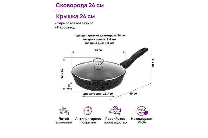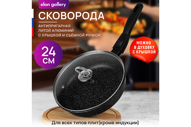 Глубокая сковорода Elan Gallery "Чёрный мр..показатьамор" с крышкой и съёмной ручкой из серии "Гармония вкуса" диаметром 24 см равномерно разогревается и распределяет тепло, поэтому продукты в ней сохраняют полезные свойства и сочность. Диаметр дна — 18,7 см. Стильный дизайн подойдет к любому интерьеру кухни. Подходит для приготовления стейков и любых блюд из рыбы, мяса или овощей. Сковорода с глубоким дном выполнена из толстостенного литого алюминия и имеет ультрапрочное двухслойное антипригарное покрытие PFLUON COOKMARK. Оно устойчиво к царапинам и износу, безопасно для здоровья и не содержит PFOA или других вредных веществ. Используйте для жарки котлет или картофеля с минимальным количеством масла. Здоровую пищу оценит любой гурман! Готовьте на завтрак оладьи или блюда из яиц: омлет, яичницу. Порадуйте близких большой порцией блинов на Масленицу, ни один блинчик не подгорит. Алюминиевая сковородка с толстым дном имеет удобную ручку, которая обеспечивает надежный захват при подаче еды с плиты на стол. Без ручки можно использовать в духовом шкафу как форму для запекания. Приготовьте румяную курочку в духовке и порадуйте своих близких. Эксплуатация: не нагревать без продуктов. Дайте посуде остыть, прежде чем помещать ее в воду. Использовать только деревянные, силиконовые и пластиковые лопатки без острых краёв. Не мыть абразивными или щелочными моющими средствами. Использовать в ПММ в режиме "Эко" со средством, не содержащим щёлочи. Подходит для стеклокерамических, газовых, электрических и комбинированных плит. Не подходит для индукции. Использовать в духовке с крышкой при температуре до 200°C, без крышки – до 240°C (ручку обязательно снять!) Кухонная утварь станет приятным подарком для женщин на День Рождения, 8 Марта и придаст процессу приготовления пищи комфорта. Подарите универсальную вещь маме, подруге, сестре или бабушке. Хорошая сковорода – мечта любой хозяйки! Сковородка станет незаменимым инвентарем на вашей кухне и наполнит процесс приготовления пищи удовольствием!амор" с крышкой и съёмной ручкой из серии "Гармония вкуса" диаметром 24 см равномерно разогревается и распределяет тепло, поэтому продукты в ней сохраняют полезные свойства и сочность. Диаметр дна — 18,7 см. Стильный дизайн подойдет к любому интерьеру кухни. Подходит для приготовления стейков и любых блюд из рыбы, мяса или овощей. Сковорода с глубоким дном выполнена из толстостенного литого алюминия и имеет ультрапрочное двухслойное антипригарное покрытие PFLUON COOKMARK. Оно устойчиво к царапинам и износу, безопасно для здоровья и не содержит PFOA или других вредных веществ. Используйте для жарки котлет или картофеля с минимальным количеством масла. Здоровую пищу оценит любой гурман! Готовьте на завтрак оладьи или блюда из яиц: омлет, яичницу. Порадуйте близких большой порцией блинов на Масленицу, ни один блинчик не подгорит. Алюминиевая сковородка с толстым дном имеет удобную ручку, которая обеспечивает надежный захват при подаче еды с плиты на стол. Без ручки можно использовать в духовом шкафу как форму для запекания. Приготовьте румяную курочку в духовке и порадуйте своих близких. Эксплуатация: не нагревать без продуктов. Дайте посуде остыть, прежде чем помещать ее в воду. Использовать только деревянные, силиконовые и пластиковые лопатки без острых краёв. Не мыть абразивным