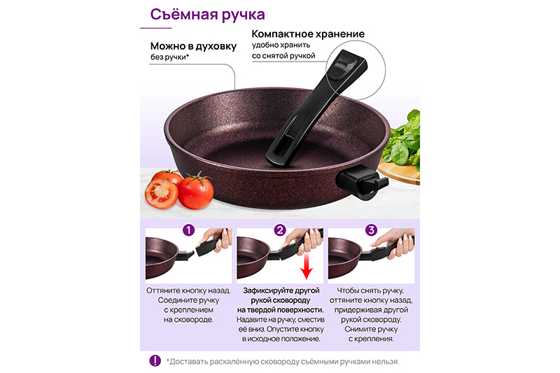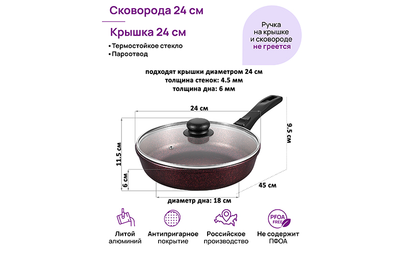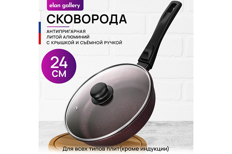Глубокая сковорода Elan Gallery "Гранат&qu..показатьot; с крышкой и съёмной ручкой из серии "Гармония вкуса" диаметром 24 см равномерно разогревается и распределяет тепло, поэтому продукты в ней сохраняют полезные свойства и сочность. Диаметр дна — 18 см. Благодаря стильному дизайну станет украшением вашей кухни. Подходит для приготовления стейков из рыбы, мяса или блюд из овощей. Сковорода с глубоким дном выполнена из толстостенного литого алюминия и имеет ультрапрочное двухслойное антипригарное покрытие Cookmark. Оно устойчиво к царапинам и износу, безопасно для здоровья и не содержит PFOA или других вредных веществ. Используйте для жарки котлет или картофеля с минимальным количеством масла. Здоровую пищу оценит любой гурман! Готовьте на завтрак оладьи или блюда из яиц: яичницу, омлет. Порадуйте близких большой порцией блинов на Масленицу, ни один блинчик не подгорит. Алюминиевая сковородка с толстым дном имеет удобную ручку, которая обеспечивает надежный захват при подаче еды с плиты на стол. Без крышки и ручки можно использовать в духовом шкафу как форму для запекания при температуре до 250°C. Не использовать съёмную ручку, чтобы достать раскалённую сковороду из духовой печи! Приготовьте румяную курочку в духовке и порадуйте своих близких. Эксплуатация: не нагревать без продуктов. Дайте посуде остыть, прежде чем помещать ее в воду. Использовать только деревянные, силиконовые и пластиковые лопатки без острых краёв. Не мыть абразивными или щелочными моющими средствами. Использовать в ПММ в режиме "Эко" со средством, не содержащим щёлочи. Подходит для стеклокерамических, газовых и электрических плит. Не подходит для индукционных плит. Кухонная утварь станет чудесным подарком на любой праздник и придаст процессу приготовления пищи новый уровень комфорта!ot; с крышкой и съёмной ручкой из серии "Гармония вкуса" диаметром 24 см равномерно разогревается и распределяет тепло, поэтому продукты в ней сохраняют полезные свойства и сочность. Диаметр дна — 18 см. Благодаря стильному дизайну станет украшением вашей кухни. Подходит для приготовления стейков из рыбы, мяса или блюд из овощей. Сковорода с глубоким дном выполнена из толстостенного литого алюминия и имеет ультрапрочное двухслойное антипригарное покрытие Cookmark. Оно устойчиво к царапинам и износу, безопасно для здоровья и не содержит PFOA или других вредных веществ. Используйте для жарки котлет или картофеля с минимальным количеством масла. Здоровую пищу оценит любой гурман! Готовьте на завтрак оладьи или блюда из яиц: яичницу, омлет. Порадуйте близких большой порцией блинов на Масленицу, ни один блинчик не подгорит. Алюминиевая сковородка с толстым дном имеет удобную ручку, которая обеспечивает надежный захват при подаче еды с плиты на стол. Без крышки и ручки можно использовать в духовом шкафу как форму для запекания при температуре до 250°C. Не использовать съёмную ручку, чтобы достать раскалённую сковороду из духовой печи! Приготовьте румяную курочку в духовке и порадуйте своих близких. Эксплуатация: не нагревать без продуктов. Дайте посуде остыть, прежде чем помещать ее в воду. Использовать только деревянные, силиконовые и пластиковые лопатки без острых краёв. Не мыть абразивными или щелочными моющими средствами. Использовать в ПММ в режиме "Эко" со средством, не содержащим щёлочи. Под