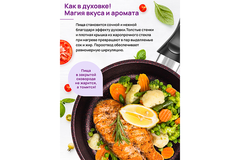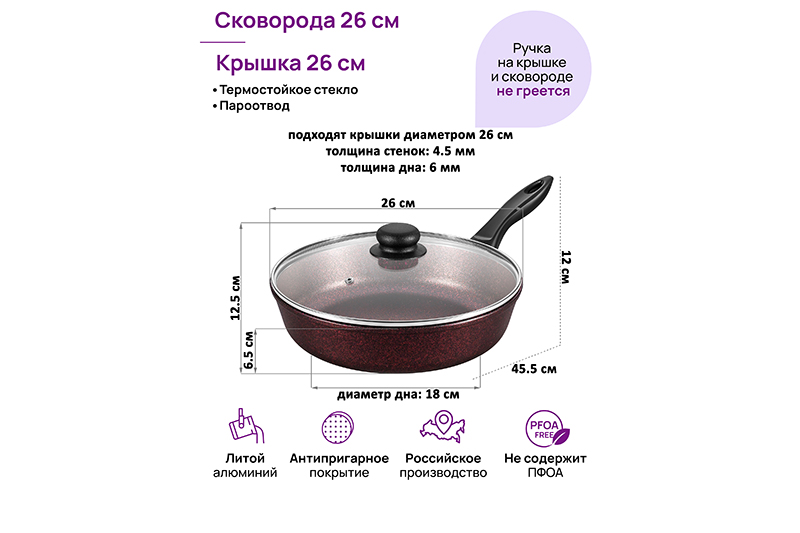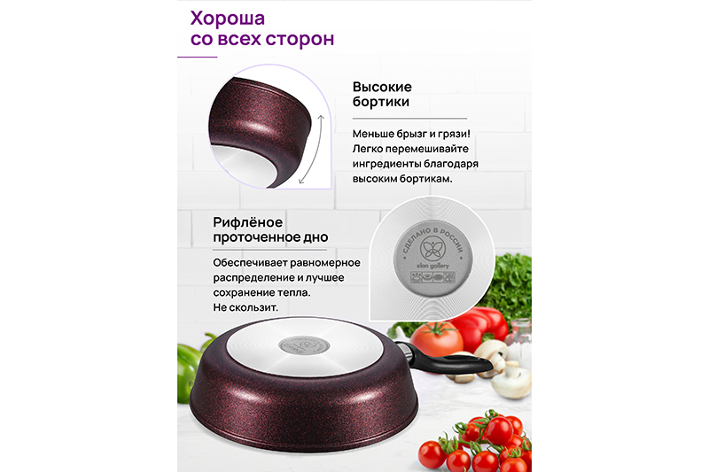 Глубокая сковорода Elan Gallery "Гранат&qu..показатьot; из серии "Гармония вкуса" диаметром 26 см с крышкой равномерно разогревается и распределяет тепло таким образом, что продукты в ней сохраняют свои полезные свойства, сочность и вкус. Диаметр дна сковороды — 18 см. Благодаря стильному дизайну станет украшением вашей кухни. Сковорода с глубоким дном выполнена из толстостенного литого алюминия и имеет ультрапрочное двухслойное антипригарное покрытие Cookmark. Оно устойчиво к царапинам и износу, полностью безопасно для здоровья и не содержит PFOA или других вредных веществ. Сковороду можно использовать для жарки с минимальным количеством масла для приготовления здоровой пищи, что оценит любой гурман. Готовьте дома любимые стейки, они сохранят свою сочность, нежность и аромат! Сковорода подходит для приготовления блюд из рыбы, мяса, овощей, а также плова. Сковородка станет идеальным помощником для создания завтрака, например: яичницы, омлета, блинов, оладий. Имеет удобную ручку, что обеспечивает надежный захват при подаче еды с плиты на стол. Стеклянная крышка позволит сохранить тепло блюда, защитит от брызг, а также поможет следить за процессом приготовления пищи. Эксплуатация: не нагревать без продуктов. Дайте посуде остыть, прежде чем помещать ее в воду. Использовать только деревянные, силиконовые и пластиковые лопатки без острых краёв. Не мыть абразивными или щелочными моющими средствами. Использовать в посудомоечной машине только в режиме "Эко" с использованием средств, не содержащих щелочи. Подходит для всех типов плит, кроме индукционных. Кухонная утварь станет чудесным подарком на любой праздник и придаст процессу приготовления пищи новый уровень комфорта!ot; из серии "Гармония вкуса" диаметром 26 см с крышкой равномерно разогревается и распределяет тепло таким образом, что продукты в ней сохраняют свои полезные свойства, сочность и вкус. Диаметр дна сковороды — 18 см. Благодаря стильному дизайну станет украшением вашей кухни. Сковорода с глубоким дном выполнена из толстостенного литого алюминия и имеет ультрапрочное двухслойное антипригарное покрытие Cookmark. Оно устойчиво к царапинам и износу, полностью безопасно для здоровья и не содержит PFOA или других вредных веществ. Сковороду можно использовать для жарки с минимальным количеством масла для приготовления здоровой пищи, что оценит любой гурман. Готовьте дома любимые стейки, они сохранят свою сочность, нежность и аромат! Сковорода подходит для приготовления блюд из рыбы, мяса, овощей, а также плова. Сковородка станет идеальным помощником для создания завтрака, например: яичницы, омлета, блинов, оладий. Имеет удобную ручку, что обеспечивает надежный захват при подаче еды с плиты на стол. Стеклянная крышка позволит сохранить тепло блюда, защитит от брызг, а также поможет следить за процессом приготовления пищи. Эксплуатация: не нагревать без продуктов. Дайте посуде остыть, прежде чем помещать ее в воду. Использовать только деревянные, силиконовые и пластиковые лопатки без острых краёв. Не мыть абразивными или щелочными моющими средствами. Использовать в посудомоечной машине только в режиме "Эко" с использованием средств, не содержащих щелочи. Подходит для всех типов плит, кроме индукционных. Кухонная утварь станет чудесным подарком на любой праздник и придаст процессу приго