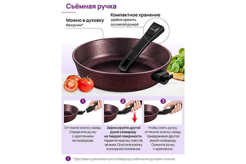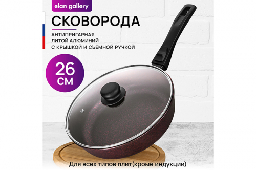 Глубокая сковорода Elan Gallery "Гранат&qu..показатьot; с крышкой и съёмной ручкой из серии "Гармония вкуса" диаметром 26 см равномерно разогревается и распределяет тепло, поэтому продукты в ней сохраняют полезные свойства и сочность. Диаметр дна — 18 см. Благодаря стильному дизайну станет украшением вашей кухни. Подходит для приготовления стейков из рыбы, мяса или блюд из овощей. Сковорода с глубоким дном выполнена из толстостенного литого алюминия и имеет ультрапрочное двухслойное антипригарное покрытие Cookmark. Оно устойчиво к царапинам и износу, безопасно для здоровья и не содержит PFOA или других вредных веществ. Используйте для жарки котлет или картофеля с минимальным количеством масла. Здоровую пищу оценит любой гурман! Готовьте на завтрак оладьи или блюда из яиц: яичницу, омлет. Порадуйте близких большой порцией блинов на Масленицу, ни один блинчик не подгорит. Алюминиевая сковородка с толстым дном имеет удобную ручку, которая обеспечивает надежный захват при подаче еды с плиты на стол. Без крышки и ручки можно использовать в духовом шкафу как форму для запекания при температуре до 250°C. Не использовать съёмную ручку, чтобы достать раскалённую сковороду из духовой печи! Приготовьте румяную курочку в духовке и порадуйте своих близких. Эксплуатация: не нагревать без продуктов. Дайте посуде остыть, прежде чем помещать ее в воду. Использовать только деревянные, силиконовые и пластиковые лопатки без острых краёв. Не мыть абразивными или щелочными моющими средствами. Использовать в ПММ в режиме "Эко" со средством, не содержащим щёлочи. Подходит для стеклокерамических, газовых и электрических плит. Не подходит для индукционных плит. Кухонная утварь станет чудесным подарком на любой праздник и придаст процессу приготовления пищи новый уровень комфорта!ot; с крышкой и съёмной ручкой из серии "Гармония вкуса" диаметром 26 см равномерно разогревается и распределяет тепло, поэтому продукты в ней сохраняют полезные свойства и сочность. Диаметр дна — 18 см. Благодаря стильному дизайну станет украшением вашей кухни. Подходит для приготовления стейков из рыбы, мяса или блюд из овощей. Сковорода с глубоким дном выполнена из толстостенного литого алюминия и имеет ультрапрочное двухслойное антипригарное покрытие Cookmark. Оно устойчиво к царапинам и износу, безопасно для здоровья и не содержит PFOA или других вредных веществ. Используйте для жарки котлет или картофеля с минимальным количеством масла. Здоровую пищу оценит любой гурман! Готовьте на завтрак оладьи или блюда из яиц: яичницу, омлет. Порадуйте близких большой порцией блинов на Масленицу, ни один блинчик не подгорит. Алюминиевая сковородка с толстым дном имеет удобную ручку, которая обеспечивает надежный захват при подаче еды с плиты на стол. Без крышки и ручки можно использовать в духовом шкафу как форму для запекания при температуре до 250°C. Не использовать съёмную ручку, чтобы достать раскалённую сковороду из духовой печи! Приготовьте румяную курочку в духовке и порадуйте своих близких. Эксплуатация: не нагревать без продуктов. Дайте посуде остыть, прежде чем помещать ее в воду. Использовать только деревянные, силиконовые и пластиковые лопатки без острых краёв. Не мыть абразивными или щелочными моющими средствами. Использовать в ПММ в режиме "Эко" со средством, не содержащим щёлочи. Под