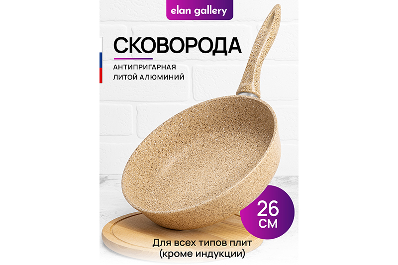 Глубокая сковорода Elan Gallery "Медовый г..показатьранит" из серии "Гармония вкуса" диаметром 26 см равномерно разогревается и распределяет тепло таким образом, что продукты в ней сохраняют свои полезные свойства, сочность и вкус. Диаметр дна сковороды — 18 см. Стильный дизайн, имитирующий гранит, подойдет к любому интерьеру вашей кухни. Сковорода с глубоким дном выполнена из толстостенного литого алюминия и имеет ультрапрочное двухслойное антипригарное покрытие Cookmark. Оно устойчиво к царапинам и износу, полностью безопасно для здоровья и не содержит PFOA или других вредных веществ. Сковороду можно использовать для жарки с минимальным количеством масла для приготовления здоровой пищи, что оценит любой гурман. Готовьте дома любимые стейки, они сохранят свою сочность, нежность и аромат! Сковорода подходит для приготовления блюд из рыбы, мяса и овощей. Сковородка станет идеальным помощником для создания завтрака, например: яичницы, омлета, блинов, оладий. Имеет удобную ручку, что обеспечивает надежный захват при подаче еды с плиты на стол. Эксплуатация: не нагревать без продуктов. Дайте посуде остыть, прежде чем помещать ее в воду. Использовать только деревянные, силиконовые и пластиковые лопатки без острых краёв. Не мыть абразивными или щелочными моющими средствами. Использовать в посудомоечной машине только в режиме "Эко" с использованием средств, не содержащих щелочи. Подходит для всех типов плит, кроме индукционных. Сковорода станет идеальным подарком для женщин и придаст процессу приготовления пищи новый уровень комфорта. Подарите такую универсальную вещь маме, подруге, сестре или тёте. Хорошая сковорода – мечта любой хозяйки! Со сковородкой "Гармония вкуса" вы можете готовить с радостью и любовью, создавая вкусные блюда для себя и своих гостей. Она станет незаменимым инвентарем на вашей кухне, сделает процесс приготовления пищи легким и наполнит его удовольствием!ранит" из серии "Гармония вкуса" диаметром 26 см равномерно разогревается и распределяет тепло таким образом, что продукты в ней сохраняют свои полезные свойства, сочность и вкус. Диаметр дна сковороды — 18 см. Стильный дизайн, имитирующий гранит, подойдет к любому интерьеру вашей кухни. Сковорода с глубоким дном выполнена из толстостенного литого алюминия и имеет ультрапрочное двухслойное антипригарное покрытие Cookmark. Оно устойчиво к царапинам и износу, полностью безопасно для здоровья и не содержит PFOA или других вредных веществ. Сковороду можно использовать для жарки с минимальным количеством масла для приготовления здоровой пищи, что оценит любой гурман. Готовьте дома любимые стейки, они сохранят свою сочность, нежность и аромат! Сковорода подходит для приготовления блюд из рыбы, мяса и овощей. Сковородка станет идеальным помощником для создания завтрака, например: яичницы, омлета, блинов, оладий. Имеет удобную ручку, что обеспечивает надежный захват при подаче еды с плиты на стол. Эксплуатация: не нагревать без продуктов. Дайте посуде остыть, прежде чем помещать ее в воду. Использовать только деревянные, силиконовые и пластиковые лопатки без острых краёв. Не мыть абразивными или щелочными моющими средствами. Использовать в посудомоечной машине только в режиме "Эко" с использованием средств, не содержащих щелочи. Подходит для всех типов плит, кроме индукционны