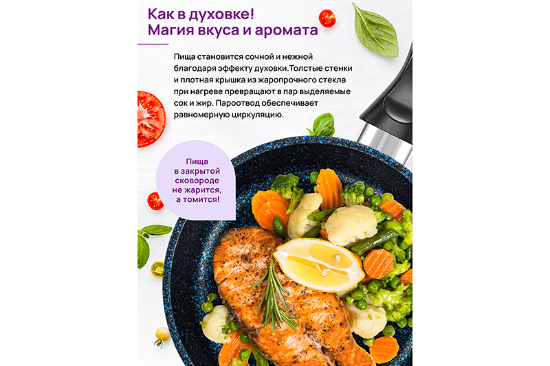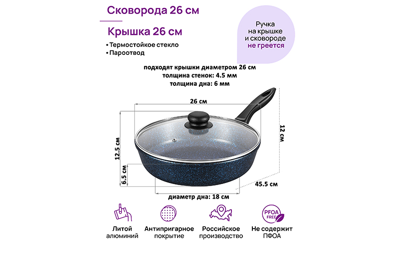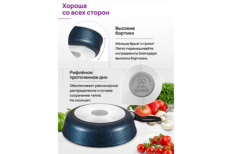 Глубокая сковорода Elan Gallery "Сапфир&qu..показатьot; из серии "Гармония вкуса" диаметром 26 см с крышкой равномерно разогревается и распределяет тепло таким образом, что продукты в ней сохраняют свои полезные свойства, сочность и вкус. Диаметр дна сковороды — 18 см. Благодаря стильному дизайну станет украшением вашей кухни. Сковорода с глубоким дном выполнена из толстостенного литого алюминия и имеет ультрапрочное двухслойное антипригарное покрытие Cookmark. Оно устойчиво к царапинам и износу, полностью безопасно для здоровья и не содержит PFOA или других вредных веществ. Сковороду можно использовать для жарки с минимальным количеством масла для приготовления здоровой пищи, что оценит любой гурман. Готовьте дома любимые стейки, они сохранят свою сочность, нежность и аромат! Сковорода подходит для приготовления блюд из рыбы, мяса, овощей, а также плова. Сковородка станет идеальным помощником для создания завтрака, например: яичницы, омлета, блинов, оладий. Имеет удобную ручку, что обеспечивает надежный захват при подаче еды с плиты на стол. Стеклянная крышка позволит сохранить тепло блюда, защитит от брызг, а также поможет следить за процессом приготовления пищи. Эксплуатация: не нагревать без продуктов. Дайте посуде остыть, прежде чем помещать ее в воду. Использовать только деревянные, силиконовые и пластиковые лопатки без острых краёв. Не мыть абразивными или щелочными моющими средствами. Использовать в посудомоечной машине только в режиме "Эко" с использованием средств, не содержащих щелочи. Подходит для всех типов плит, кроме индукционных. Кухонная утварь станет чудесным подарком на любой праздник и придаст процессу приготовления пищи новый уровень комфорта!ot; из серии "Гармония вкуса" диаметром 26 см с крышкой равномерно разогревается и распределяет тепло таким образом, что продукты в ней сохраняют свои полезные свойства, сочность и вкус. Диаметр дна сковороды — 18 см. Благодаря стильному дизайну станет украшением вашей кухни. Сковорода с глубоким дном выполнена из толстостенного литого алюминия и имеет ультрапрочное двухслойное антипригарное покрытие Cookmark. Оно устойчиво к царапинам и износу, полностью безопасно для здоровья и не содержит PFOA или других вредных веществ. Сковороду можно использовать для жарки с минимальным количеством масла для приготовления здоровой пищи, что оценит любой гурман. Готовьте дома любимые стейки, они сохранят свою сочность, нежность и аромат! Сковорода подходит для приготовления блюд из рыбы, мяса, овощей, а также плова. Сковородка станет идеальным помощником для создания завтрака, например: яичницы, омлета, блинов, оладий. Имеет удобную ручку, что обеспечивает надежный захват при подаче еды с плиты на стол. Стеклянная крышка позволит сохранить тепло блюда, защитит от брызг, а также поможет следить за процессом приготовления пищи. Эксплуатация: не нагревать без продуктов. Дайте посуде остыть, прежде чем помещать ее в воду. Использовать только деревянные, силиконовые и пластиковые лопатки без острых краёв. Не мыть абразивными или щелочными моющими средствами. Использовать в посудомоечной машине только в режиме "Эко" с использованием средств, не содержащих щелочи. Подходит для всех типов плит, кроме индукционных. Кухонная утварь станет чудесным подарком на любой праздник и придаст процессу приго