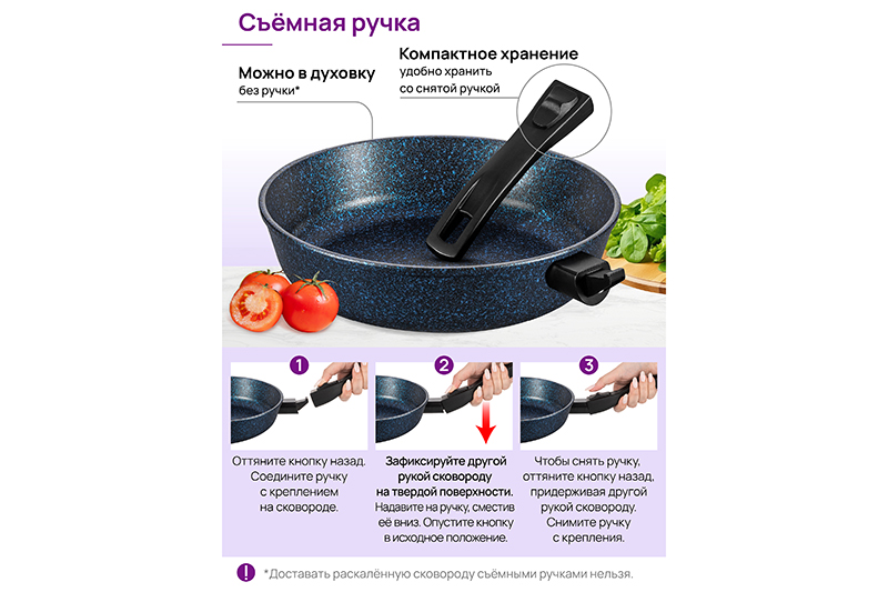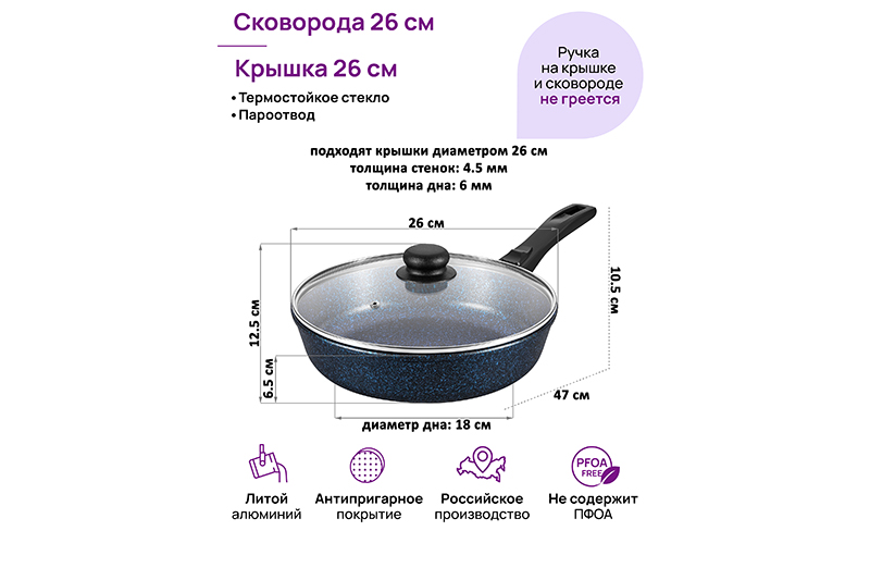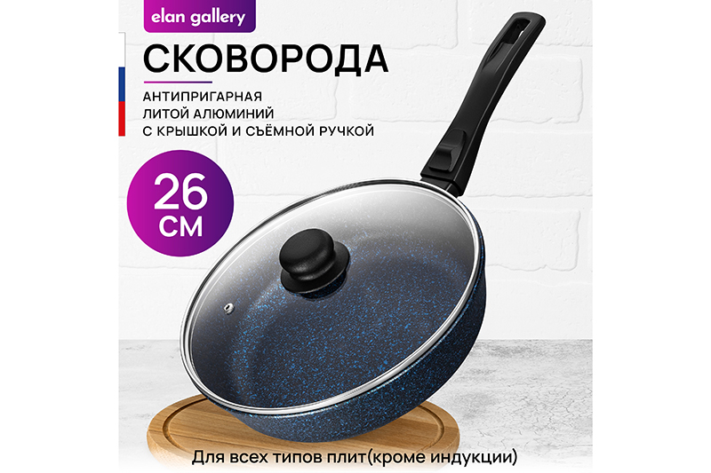 Глубокая сковорода Elan Gallery "Сапфир&qu..показатьot; с крышкой и съёмной ручкой из серии "Гармония вкуса" диаметром 26 см равномерно разогревается и распределяет тепло, поэтому продукты в ней сохраняют полезные свойства и сочность. Диаметр дна — 18 см. Благодаря стильному дизайну станет украшением вашей кухни. Подходит для приготовления стейков из рыбы, мяса или блюд из овощей. Сковорода с глубоким дном выполнена из толстостенного литого алюминия и имеет ультрапрочное двухслойное антипригарное покрытие Cookmark. Оно устойчиво к царапинам и износу, безопасно для здоровья и не содержит PFOA или других вредных веществ. Используйте для жарки котлет или картофеля с минимальным количеством масла. Здоровую пищу оценит любой гурман! Готовьте на завтрак оладьи или блюда из яиц: яичницу, омлет. Порадуйте близких большой порцией блинов на Масленицу, ни один блинчик не подгорит. Алюминиевая сковородка с толстым дном имеет удобную ручку, которая обеспечивает надежный захват при подаче еды с плиты на стол. Без крышки и ручки можно использовать в духовом шкафу как форму для запекания при температуре до 250°C. Не использовать съёмную ручку, чтобы достать раскалённую сковороду из духовой печи! Приготовьте румяную курочку в духовке и порадуйте своих близких. Эксплуатация: не нагревать без продуктов. Дайте посуде остыть, прежде чем помещать ее в воду. Использовать только деревянные, силиконовые и пластиковые лопатки без острых краёв. Не мыть абразивными или щелочными моющими средствами. Использовать в ПММ в режиме "Эко" со средством, не содержащим щёлочи. Подходит для стеклокерамических, газовых и электрических плит. Не подходит для индукционных плит. Кухонная утварь станет чудесным подарком на любой праздник и придаст процессу приготовления пищи новый уровень комфорта!ot; с крышкой и съёмной ручкой из серии "Гармония вкуса" диаметром 26 см равномерно разогревается и распределяет тепло, поэтому продукты в ней сохраняют полезные свойства и сочность. Диаметр дна — 18 см. Благодаря стильному дизайну станет украшением вашей кухни. Подходит для приготовления стейков из рыбы, мяса или блюд из овощей. Сковорода с глубоким дном выполнена из толстостенного литого алюминия и имеет ультрапрочное двухслойное антипригарное покрытие Cookmark. Оно устойчиво к царапинам и износу, безопасно для здоровья и не содержит PFOA или других вредных веществ. Используйте для жарки котлет или картофеля с минимальным количеством масла. Здоровую пищу оценит любой гурман! Готовьте на завтрак оладьи или блюда из яиц: яичницу, омлет. Порадуйте близких большой порцией блинов на Масленицу, ни один блинчик не подгорит. Алюминиевая сковородка с толстым дном имеет удобную ручку, которая обеспечивает надежный захват при подаче еды с плиты на стол. Без крышки и ручки можно использовать в духовом шкафу как форму для запекания при температуре до 250°C. Не использовать съёмную ручку, чтобы достать раскалённую сковороду из духовой печи! Приготовьте румяную курочку в духовке и порадуйте своих близких. Эксплуатация: не нагревать без продуктов. Дайте посуде остыть, прежде чем помещать ее в воду. Использовать только деревянные, силиконовые и пластиковые лопатки без острых краёв. Не мыть абразивными или щелочными моющими средствами. Использовать в ПММ в режиме "Эко" со средством, не содержащим щёлочи. Под