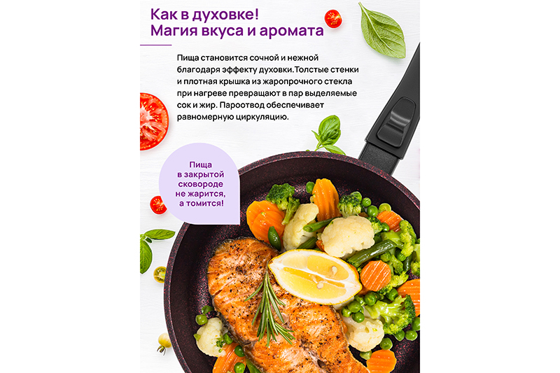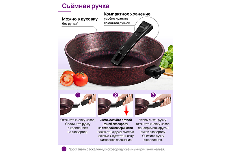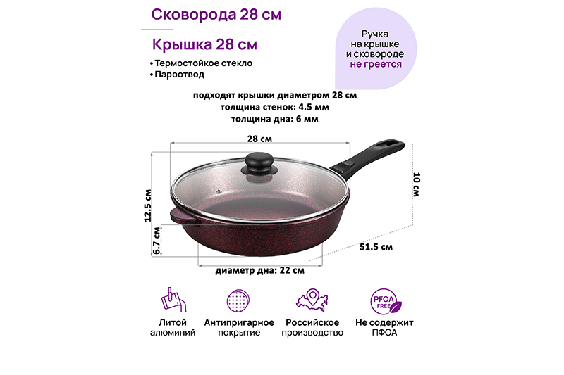 Глубокая сковорода Elan Gallery "Гранат&qu..показатьot; с крышкой и съёмной ручкой из серии "Гармония вкуса" диаметром 28 см равномерно разогревается и распределяет тепло, поэтому продукты в ней сохраняют полезные свойства и сочность. Диаметр дна — 22 см. Благодаря стильному дизайну станет украшением вашей кухни. Подходит для приготовления стейков из рыбы, мяса или блюд из овощей. Сковорода с глубоким дном выполнена из толстостенного литого алюминия и имеет ультрапрочное двухслойное антипригарное покрытие Cookmark. Оно устойчиво к царапинам и износу, безопасно для здоровья и не содержит PFOA или других вредных веществ. Используйте для жарки котлет или картофеля с минимальным количеством масла. Здоровую пищу оценит любой гурман! Готовьте на завтрак оладьи или блюда из яиц: яичницу, омлет. Порадуйте близких большой порцией блинов на Масленицу, ни один блинчик не подгорит. Алюминиевая сковородка с толстым дном имеет удобную ручку, которая обеспечивает надежный захват при подаче еды с плиты на стол. Без крышки и ручки можно использовать в духовом шкафу как форму для запекания при температуре до 250°C. Не использовать съёмную ручку, чтобы достать раскалённую сковороду из духовой печи! Приготовьте румяную курочку в духовке и порадуйте своих близких. Эксплуатация: не нагревать без продуктов. Дайте посуде остыть, прежде чем помещать ее в воду. Использовать только деревянные, силиконовые и пластиковые лопатки без острых краёв. Не мыть абразивными или щелочными моющими средствами. Использовать в ПММ в режиме "Эко" со средством, не содержащим щёлочи. Подходит для стеклокерамических, газовых и электрических плит. Не подходит для индукционных плит. Кухонная утварь станет чудесным подарком на любой праздник и придаст процессу приготовления пищи новый уровень комфорта!ot; с крышкой и съёмной ручкой из серии "Гармония вкуса" диаметром 28 см равномерно разогревается и распределяет тепло, поэтому продукты в ней сохраняют полезные свойства и сочность. Диаметр дна — 22 см. Благодаря стильному дизайну станет украшением вашей кухни. Подходит для приготовления стейков из рыбы, мяса или блюд из овощей. Сковорода с глубоким дном выполнена из толстостенного литого алюминия и имеет ультрапрочное двухслойное антипригарное покрытие Cookmark. Оно устойчиво к царапинам и износу, безопасно для здоровья и не содержит PFOA или других вредных веществ. Используйте для жарки котлет или картофеля с минимальным количеством масла. Здоровую пищу оценит любой гурман! Готовьте на завтрак оладьи или блюда из яиц: яичницу, омлет. Порадуйте близких большой порцией блинов на Масленицу, ни один блинчик не подгорит. Алюминиевая сковородка с толстым дном имеет удобную ручку, которая обеспечивает надежный захват при подаче еды с плиты на стол. Без крышки и ручки можно использовать в духовом шкафу как форму для запекания при температуре до 250°C. Не использовать съёмную ручку, чтобы достать раскалённую сковороду из духовой печи! Приготовьте румяную курочку в духовке и порадуйте своих близких. Эксплуатация: не нагревать без продуктов. Дайте посуде остыть, прежде чем помещать ее в воду. Использовать только деревянные, силиконовые и пластиковые лопатки без острых краёв. Не мыть абразивными или щелочными моющими средствами. Использовать в ПММ в режиме "Эко" со средством, не содержащим щёлочи. Под