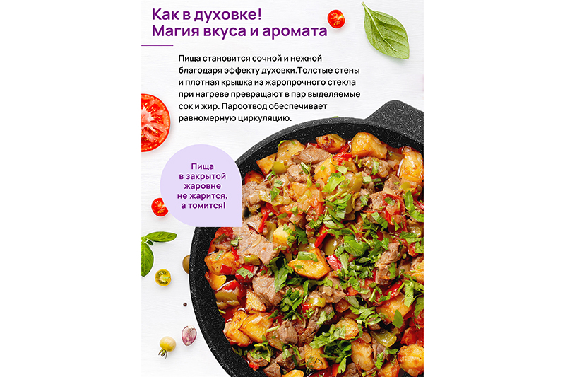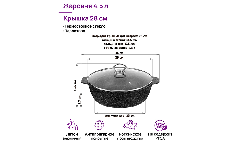 Жаровня «Чёрный мрамор» из серии «Гармония вкус..показатьа» предназначена для приготовления горячих блюд. Размер изделия – 34х29х15,5 см, объём – 4,5 литра. Высота без крышки – 9 см, высота внутренней части – 8,4 см, диаметр дна – 22 см. Сотейник изготовлен из толстостенного алюминия и имеет ультрапрочное двухслойное антипригарное покрытие Cookmark. Оно устойчиво к износу и царапинам, не содержит PFOA и других вредных веществ, что делает его полностью безопасным для здоровья. Толстые стенки и плотно прилегающая крышка из жаропрочного стекла создают при нагреве эффект духовки. Пароотвод обеспечивает равномерную циркуляцию. Жар распределяется по изделию таким образом, что продукты надолго сохраняют свои сочность, аромат и полезные свойства. Красивая алюминиевая жаровня – мечта любой хозяйки. С её помощью вы легко приготовите вкусную пищу дома и на даче. Используйте глубокий сотейник для приготовления мясных, рыбных и овощных блюд. Это универсальная кухонная утварь, подходящая для варки, жарки и тушения. Приготовьте в ней плов, бульон или самые разнообразные угощения из мяса, рыбы и овощей. Правила эксплуатации: не нагревайте без продуктов. Прежде, чем поместить в воду, дайте изделию остыть. Пользуйтесь только деревянными и силиконовыми приборами. Не мойте абразивными или щелочными моющими средствами. Использование в посудомоечной машине допускается только в режиме «Эко» с применением средств, не содержащих щёлочь. Подходит для газовых, электрических и стеклокерамических плит. Не подходит для индукции. Подход для запекания в духовом шкафу: с крышкой – при температуре до 200 градусов, без крышки – при температуре до 230 градусов. Такая посуда станет прекрасным подарком маме или бабушке. В серии «Гармония вкуса» вы найдёте сковороды, кастрюли, блинницы, казаны и жаровни. Соберите набор для вашей кухни в едином стиле и дополните свой инвентарь!а» предназначена для приготовления горячих блюд. Размер изделия – 34х29х15,5 см, объём – 4,5 литра. Высота без крышки – 9 см, высота внутренней части – 8,4 см, диаметр дна – 22 см. Сотейник изготовлен из толстостенного алюминия и имеет ультрапрочное двухслойное антипригарное покрытие Cookmark. Оно устойчиво к износу и царапинам, не содержит PFOA и других вредных веществ, что делает его полностью безопасным для здоровья. Толстые стенки и плотно прилегающая крышка из жаропрочного стекла создают при нагреве эффект духовки. Пароотвод обеспечивает равномерную циркуляцию. Жар распределяется по изделию таким образом, что продукты надолго сохраняют свои сочность, аромат и полезные свойства. Красивая алюминиевая жаровня – мечта любой хозяйки. С её помощью вы легко приготовите вкусную пищу дома и на даче. Используйте глубокий сотейник для приготовления мясных, рыбных и овощных блюд. Это универсальная кухонная утварь, подходящая для варки, жарки и тушения. Приготовьте в ней плов, бульон или самые разнообразные угощения из мяса, рыбы и овощей. Правила эксплуатации: не нагревайте без продуктов. Прежде, чем поместить в воду, дайте изделию остыть. Пользуйтесь только деревянными и силиконовыми приборами. Не мойте абразивными или щелочными моющими средствами. Использование в посудомоечной машине допускается только в режиме «Эко» с применением средств, не содержащих щёлочь. Подходит для газовых, электрических и стеклокера