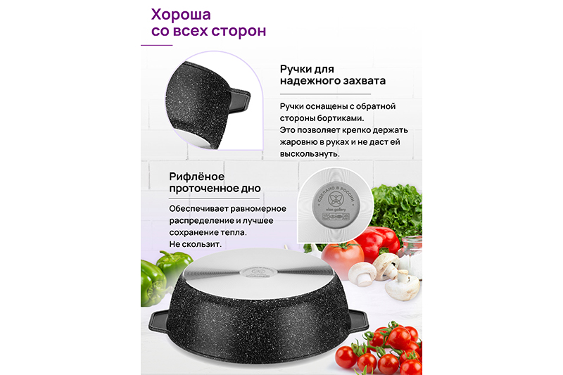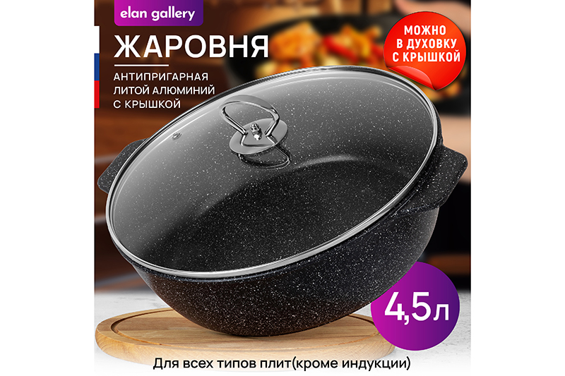 Жаровня (сотейник) 28 см 4,5 л ГАРМОНИЯ ВКУСА "Черный мрамор" С КРЫШКОЙ ф28, 34*29*15,5 см,д/духовки
