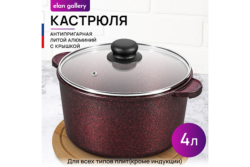 Кастрюля Elan Gallery "Гранат" из серии "Гармония вкуса" объёмом 4 литра с крышкой равномерно разогревается и распределяет тепло таким образом, что продукты в ней остаются сочными и сохраняют все полезные свойства и аромат. Диаметр стеклянной крышки – 22 см, диаметр дна – 17 см. Кастрюля с прозрачной крышкой выполнена из толстостенного литого алюминия и имеет ультрапрочное двухслойное антипригарное покрытие Cookmark. Покрытие устойчиво к царапинам и износу, полностью безопасно для здоровья и не содержит PFOA или других вредных веществ. Крышка изготовлена из жаропрочного стекла и имеет пароотвод. Алюминиевая кастрюлька с толстыми дном и стенками выполнена в стильном дизайне и позволит приготовить дома суп, кашу, плов или любой гарнир. Порадуйте близких супом с фрикадельками, борщом или куриной лапшой. Удобна для приготовления пасты, так как макаронные изделия не будут прилипать на дно благодаря антипригарной поверхности. Суповая кастрюля подойдёт для тушения и варки блюд из мяса, рыбы и овощей. Эксплуатация: кухонную утварь не нагревать без продуктов. Дайте посуде остыть, прежде чем помещать ее в воду. Использовать только деревянные и силиконовые приборы. Не мыть абразивными или щелочными моющими средствами. Использовать в ПММ только в режиме "Эко" с применением средств, не содержащих щелочи. Подходит для стеклокерамических, газовых и электрических плит. Не подходит для индукционных плит! Без крышки можно использовать в духовой печи при температуре до 250 градусов. Теперь для использования в духовке не понадобится отдельная ёмкость. Кастрюля станет полезным подарком на любой праздник и придаст процессу приготовления пищи новый уровень комфорта. В серии "Гармония вкуса" вы найдёте любой кухонный инвентарь. Соберите набор для вашей кухни или столовой в едином стиле! /