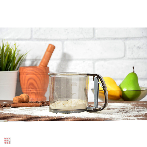 Кружка состоит из корпуса с двойным ситовым дном и ручки, внутри которой находится пружина. Благодаря ручке-рычагу вы с легкостью просеете муку, без труда потом очистите изделие от остатков.