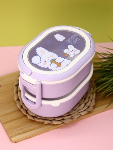 Ланч-бокс cостоит из двух ярусов, идеально подходит для использования на работе в офисе, во время, пикника, учебы в школе, спорта. Обеденный контейнер можно использовать как дома, так и в автомобиле или поезде. Изготовлен из пищевого пластика. В комплект входит ложка и вилка.