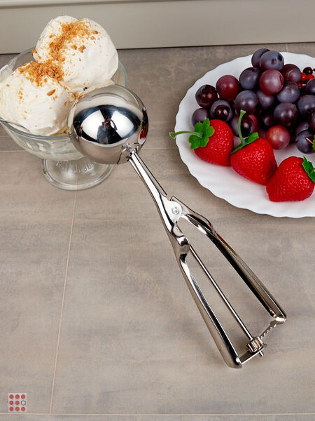 Глубокая круглая ложка, созданная для накладывания мороженого красивыми ровными шариками, как в ресторанах. Выполнена из металла, не подверженного коррозии.