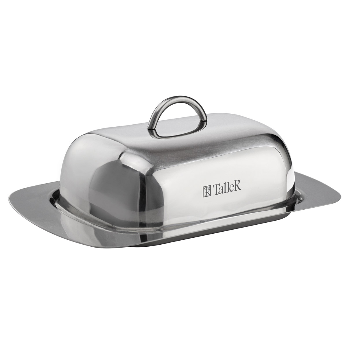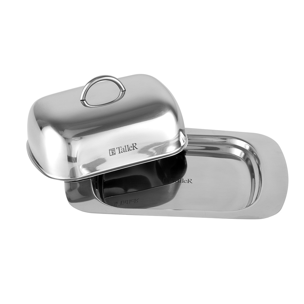Внешние размеры: 18,5 х 12,5 х 8 см. Внутренние размеры: 12 х 8,5 х 4,5 см. Вмещает 250 г масла. Высококачественная нержавеющая сталь марки 18/10 (AISI 304). Толщина стенок 0,7 мм. Полировка внешняя - зеркальная, внутренняя - зеркальная. Удобная ручка. Закругленные безопасные края. Идеальная обработка края предметов и высокое качество полировки.