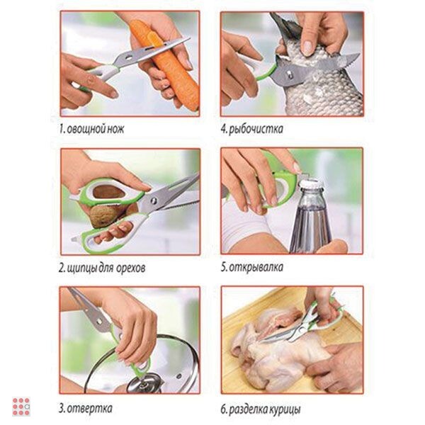Когда на вашей кухне появятся такие ножницы, вы сможете смело убрать остальные инструменты! Овощечистка, открывашка, ножницы для курицы, рыбочистка, устройство для раскалывания орехов и даже отвертка для мелкого ремонта кухонной фурнитуры – все это в одном аксессуаре!