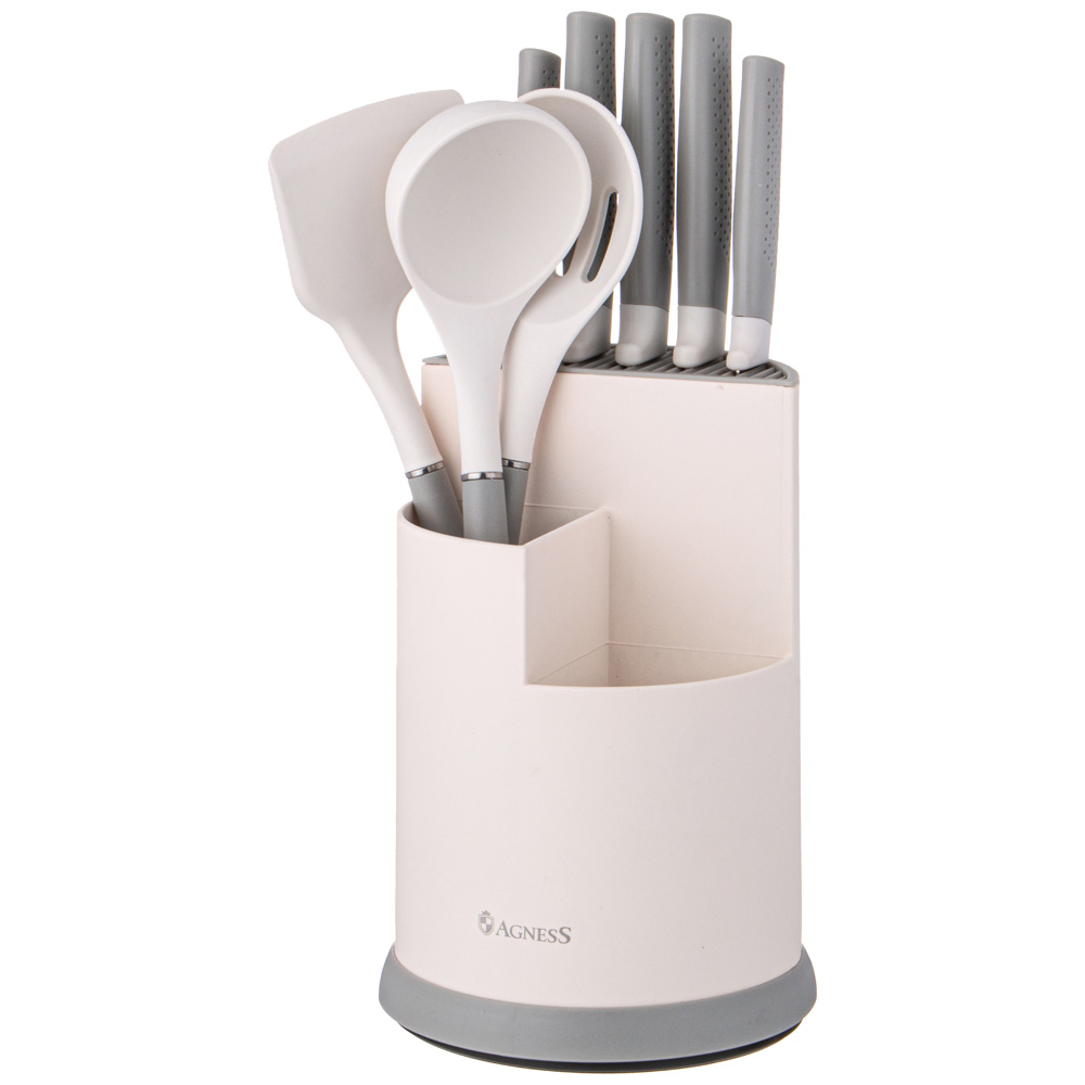 НАБОР AGNESS ИЗ 9ПР: 5 НОЖЕЙ, ПОЛОВНИК, ЛОПАТКА И ШУМОВКА, ВРАЩАЮЩАЯСЯ ПОДСТАВКА, ЦВЕТ: СЕРЫЙ